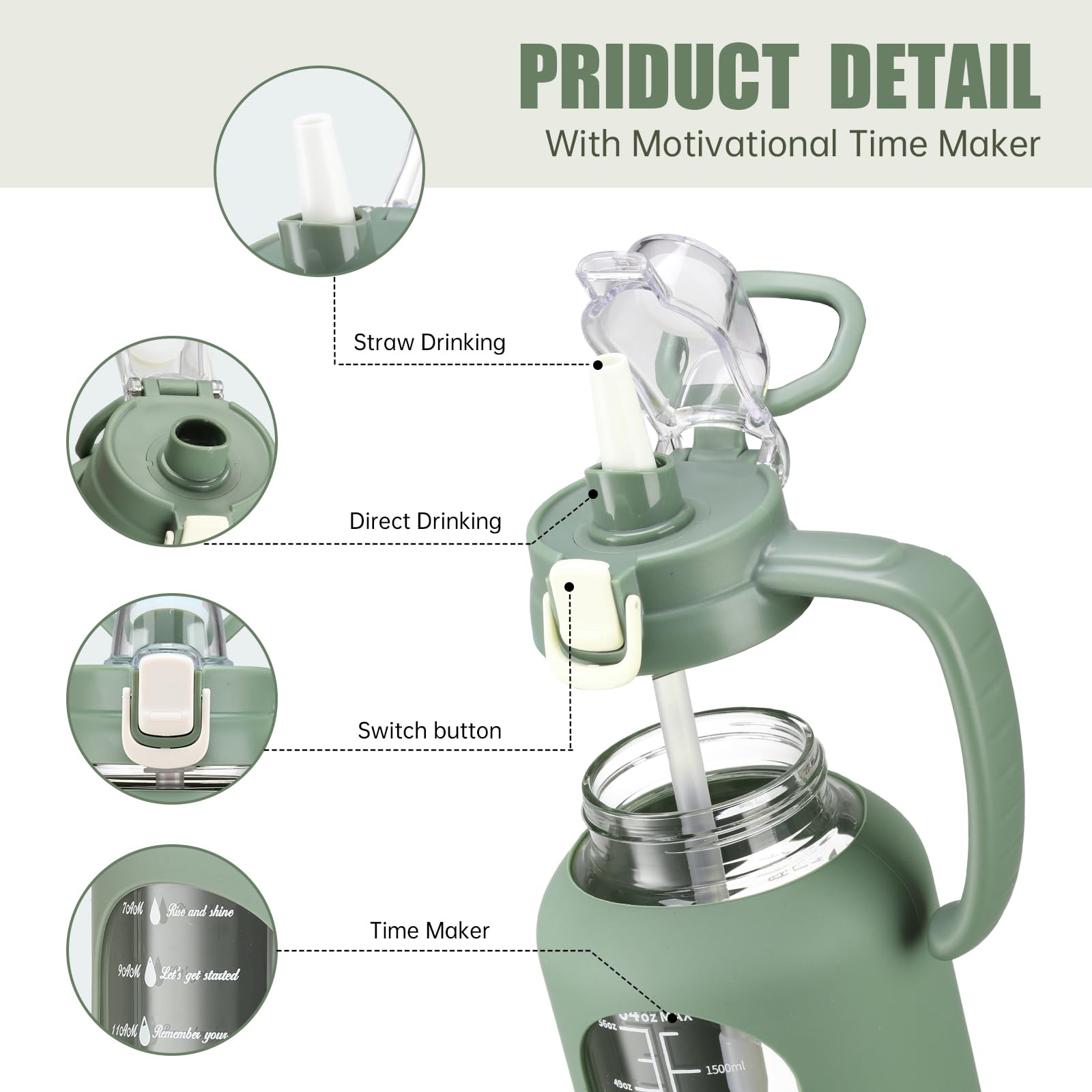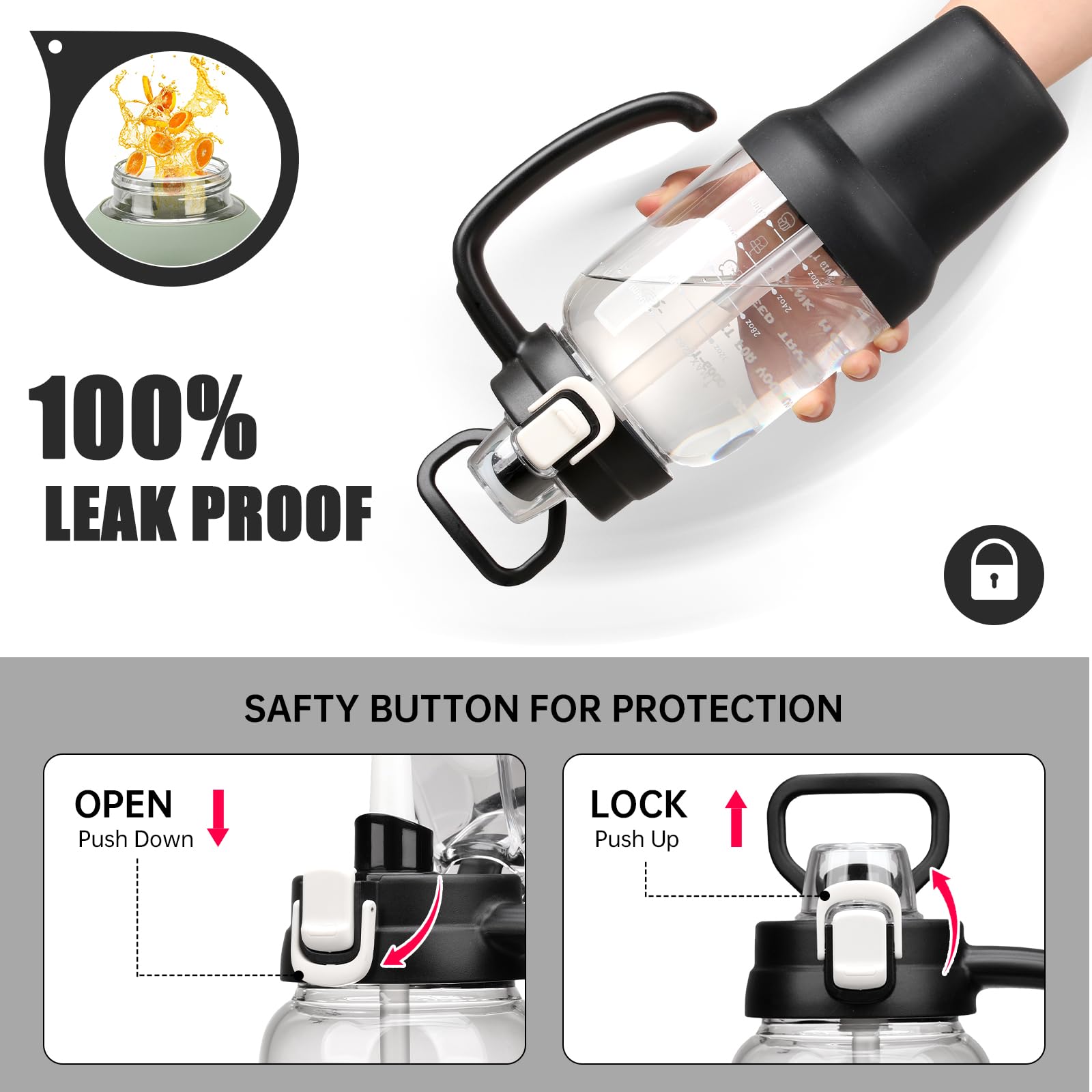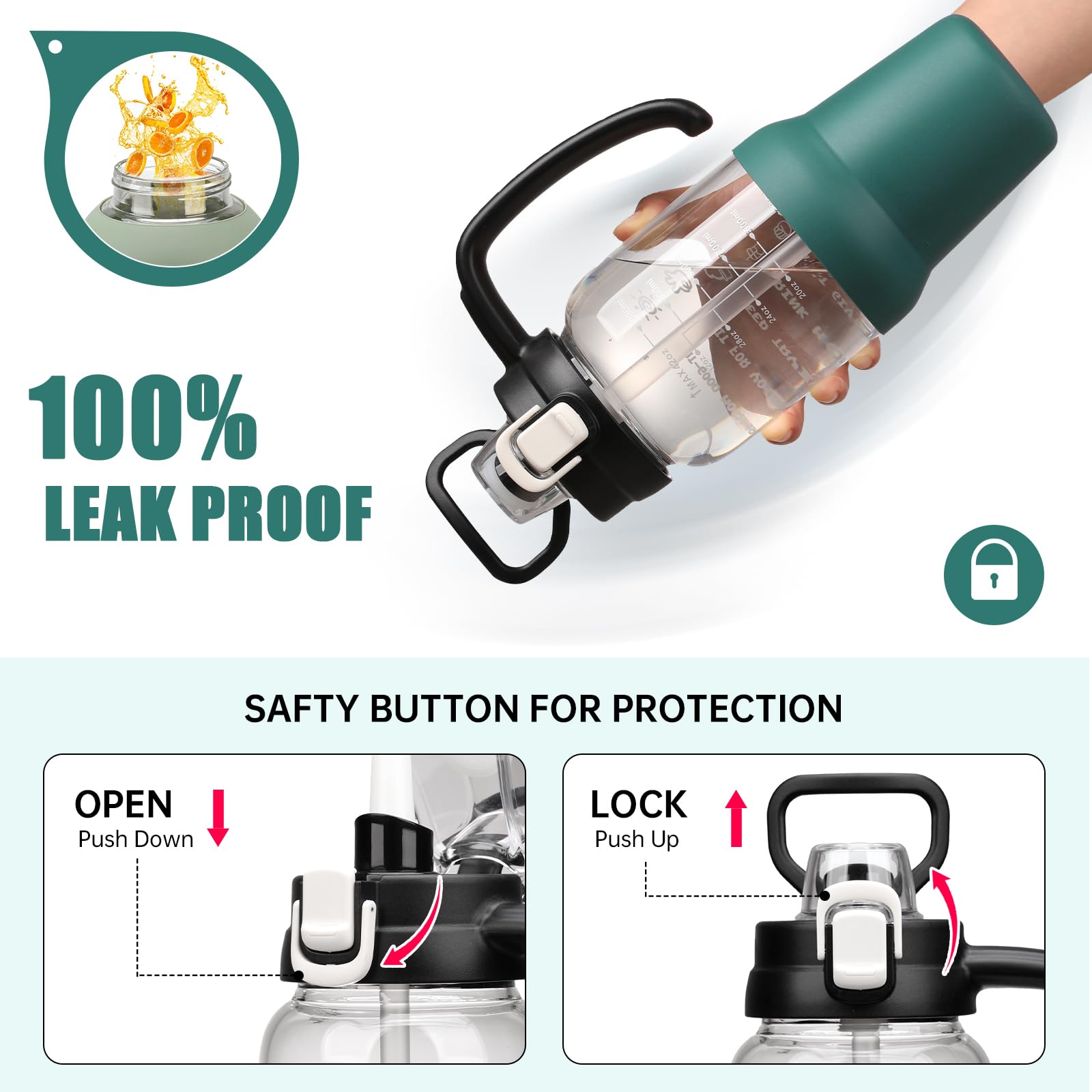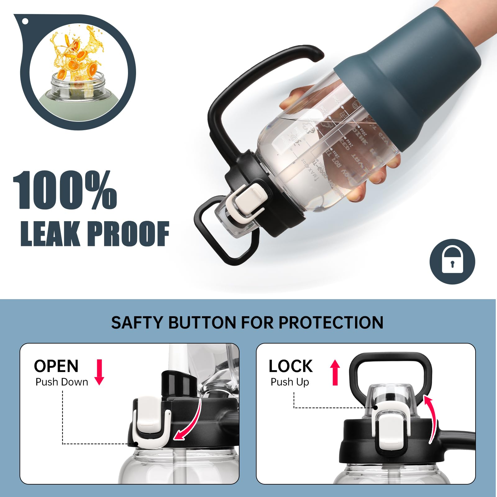 - Time and Volume Marker: The large drinking bottle with printed time and capacity markings, can track and remind you to drink water daily or after exercise, helping you develop a regular and healthy habit of drinking