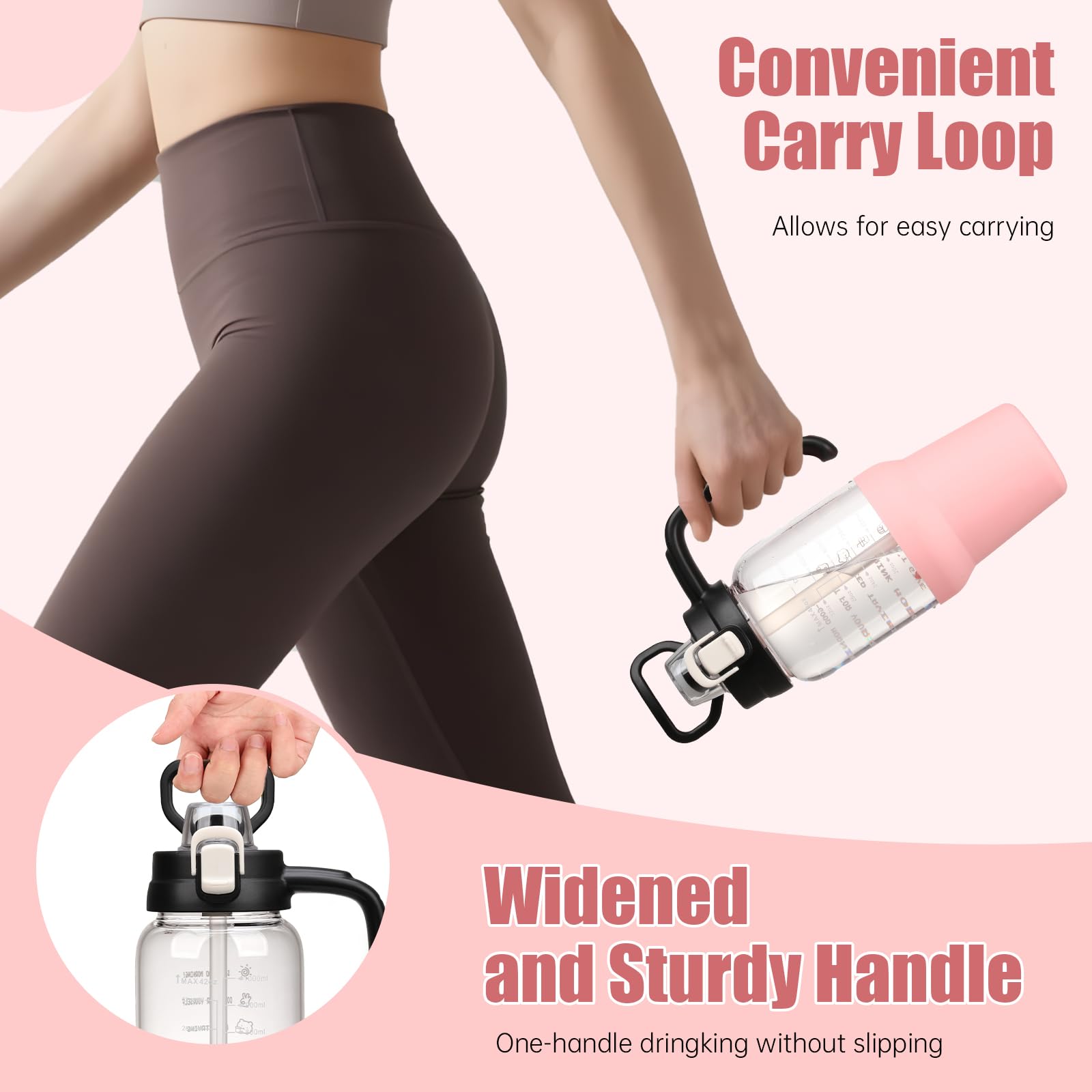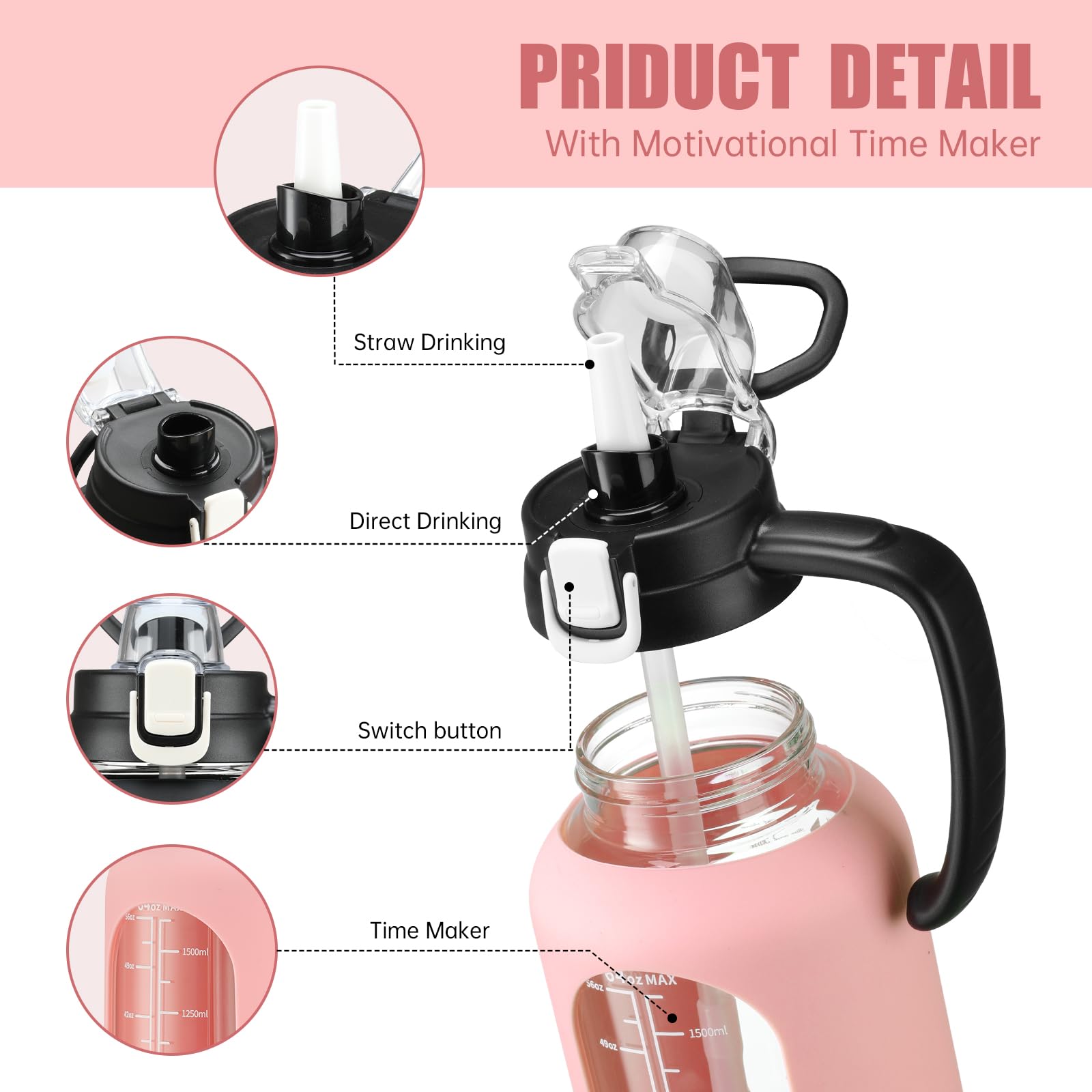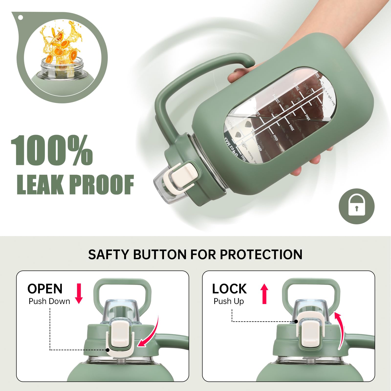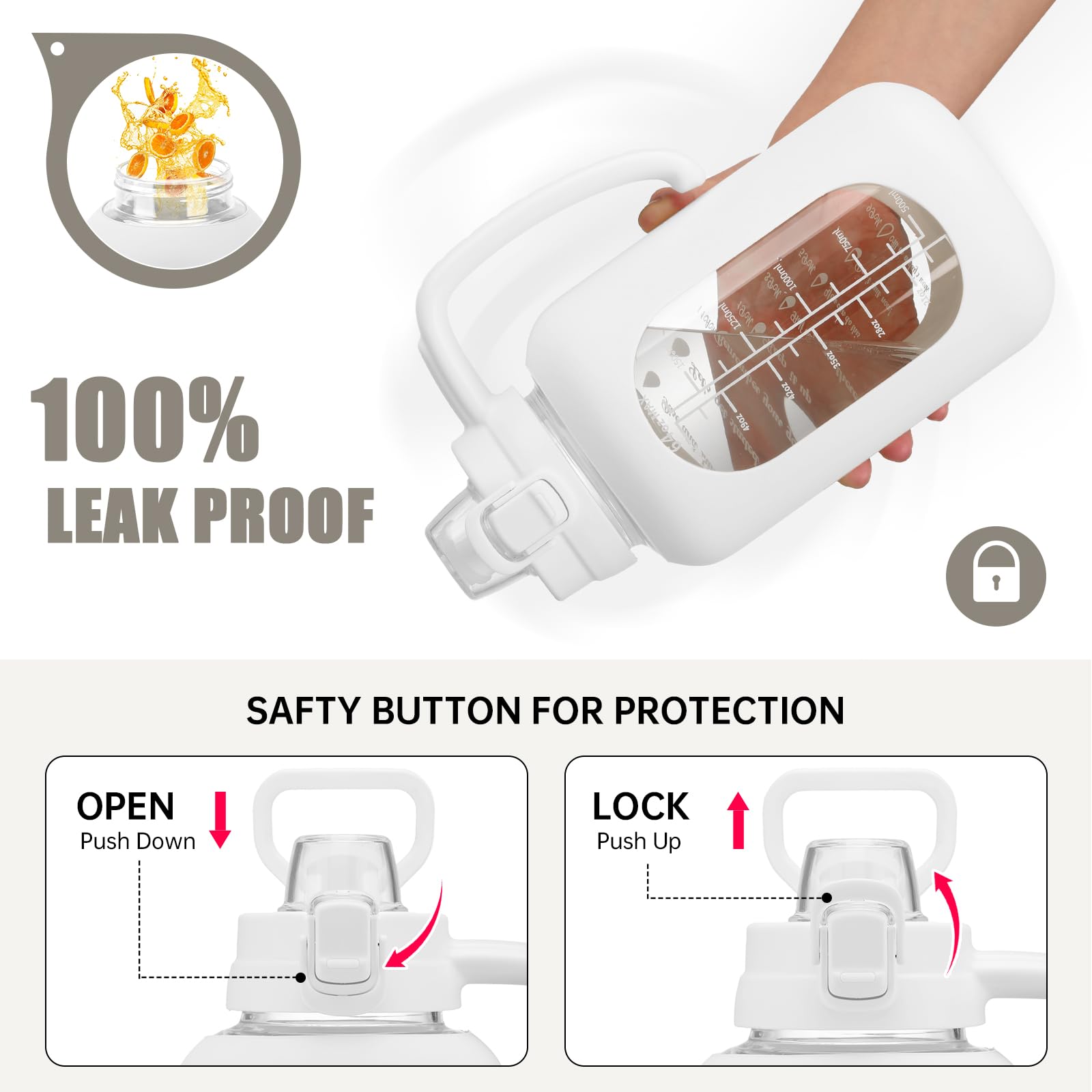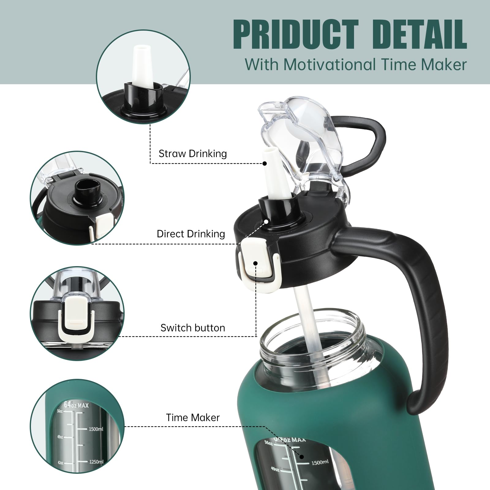 - Time and Volume Marker: The large drinking bottle with printed time and capacity markings, can track and remind you to drink water daily or after exercise, helping you develop a regular and healthy habit of drinking