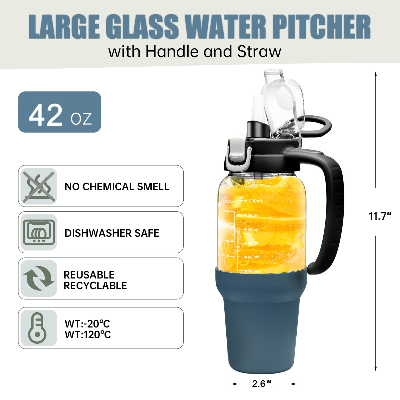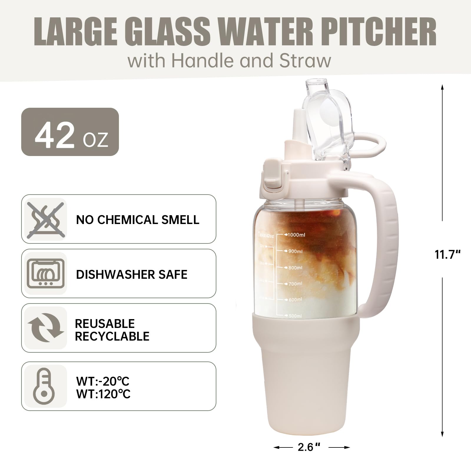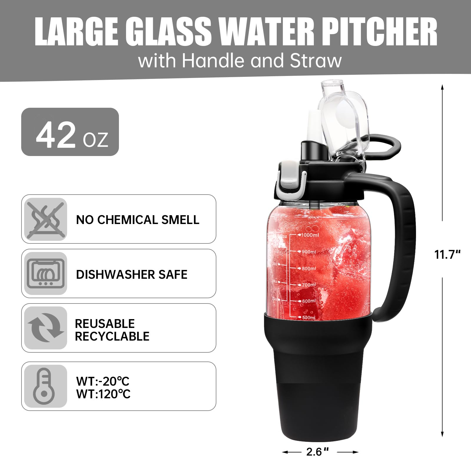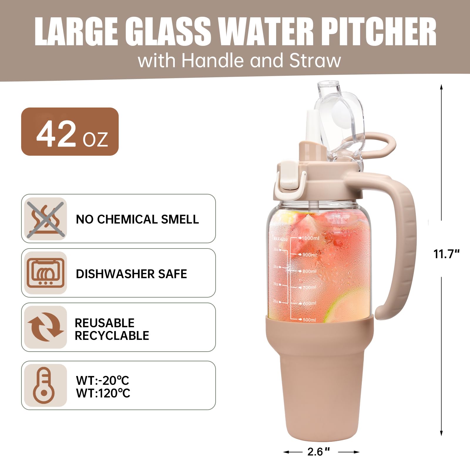 - Large Capacity and Easy to Clean: Our glass water bottles with handle designs to meet your different needs on various occasions, large enough for most person one day drinking amount, no need to fill water again. Besides, our glass bottle with wide mouth design and dishwasher safe, can be cleaned with a brush or machine