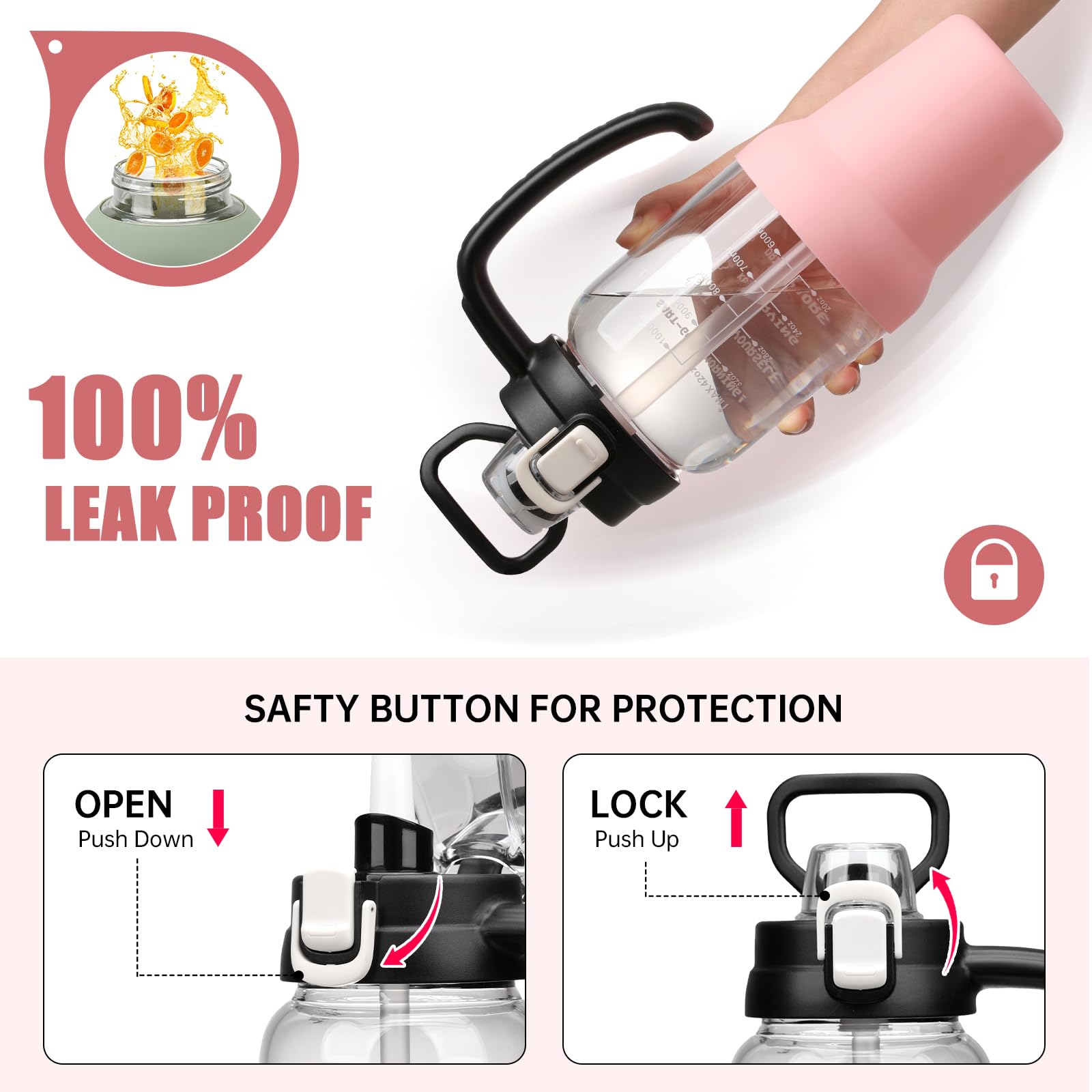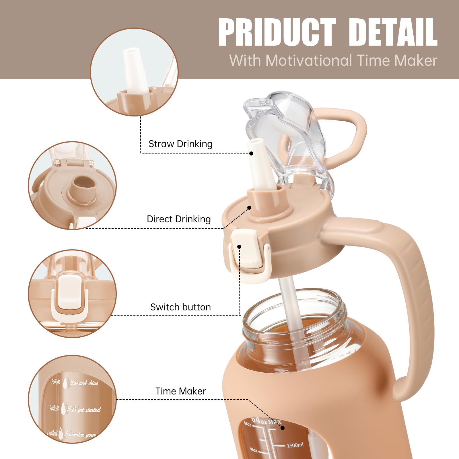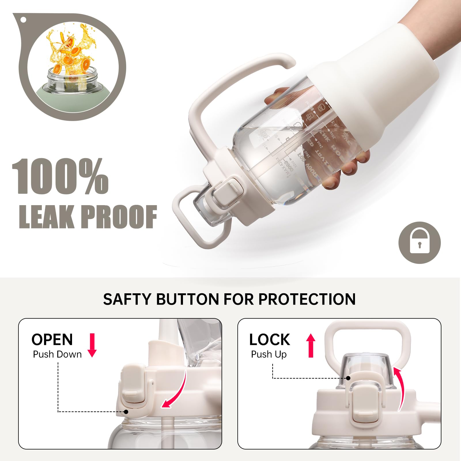 - One Touch Flip Lid: This 64oz water bottle with straw has a leakproof 2-in-1 lid,It Includes a pop-up lid that can be used as a straw or spout for versatile drinking options,Water bottles with times to drink can quick open with one hand.The flip-top lid is used a secure lock, making it dust-free and leak-proof