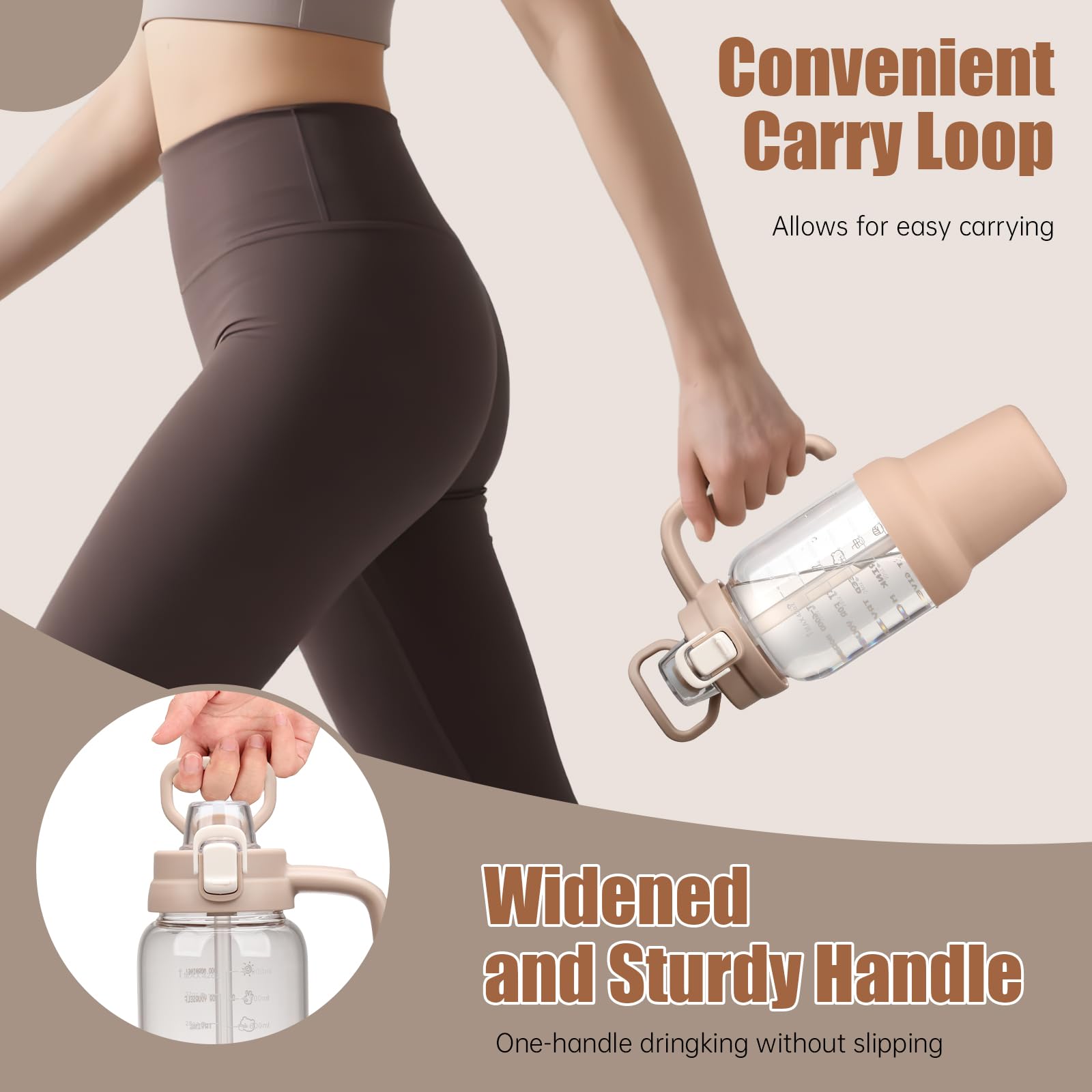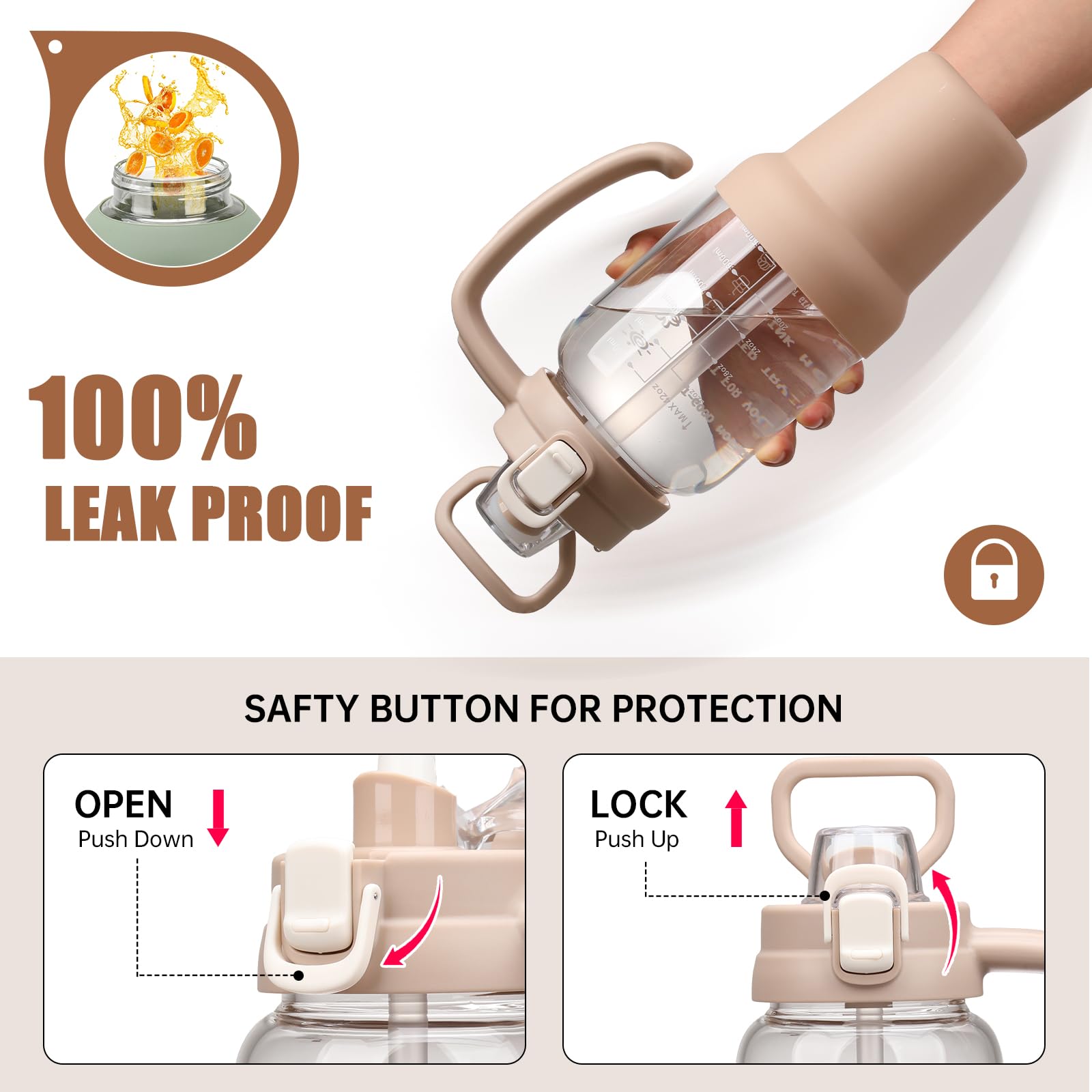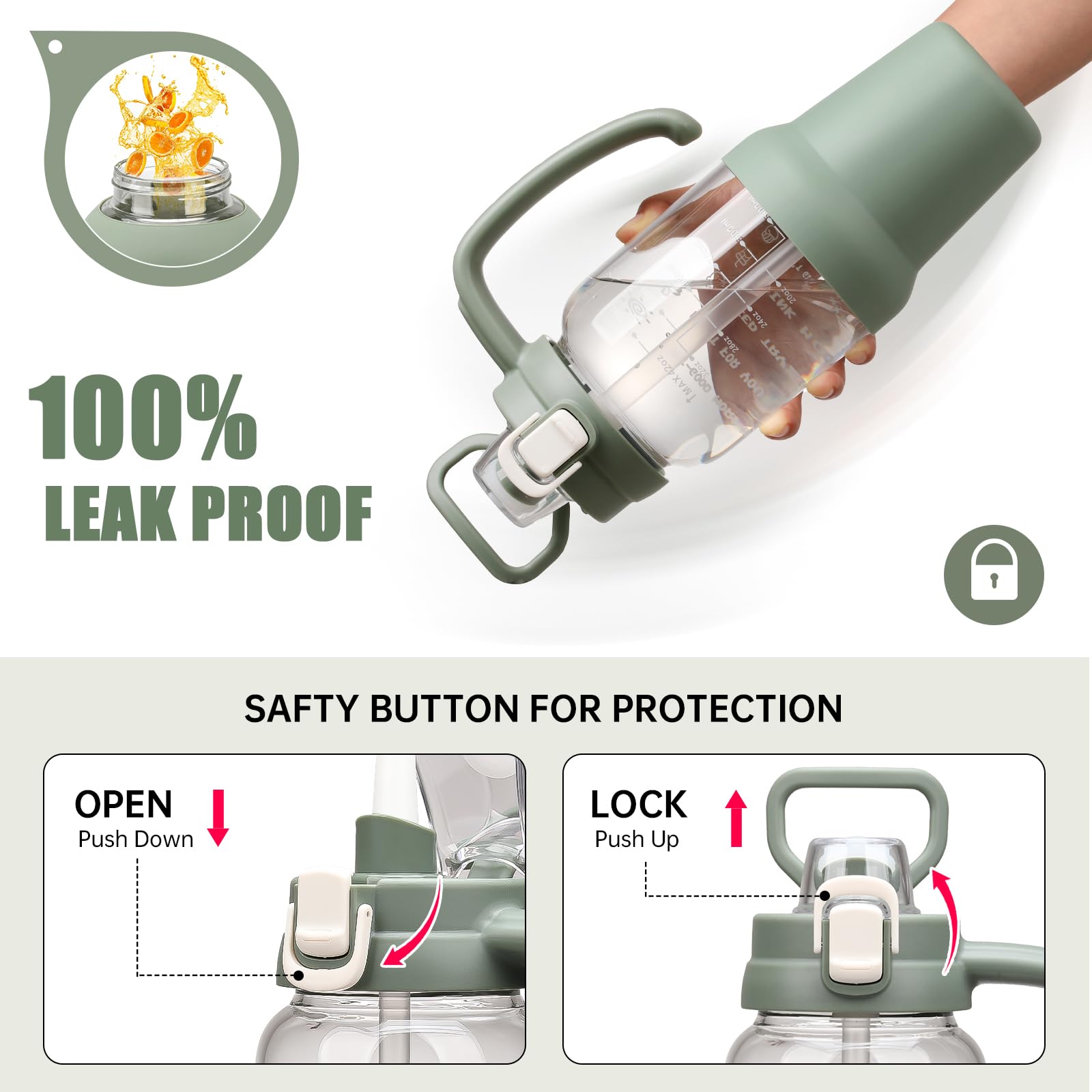 - One Touch Flip Lid: This 64oz water bottle with straw has a leakproof 2-in-1 lid,It Includes a pop-up lid that can be used as a straw or spout for versatile drinking options,Water bottles with times to drink can quick open with one hand.The flip-top lid is used a secure lock, making it dust-free and leak-proof