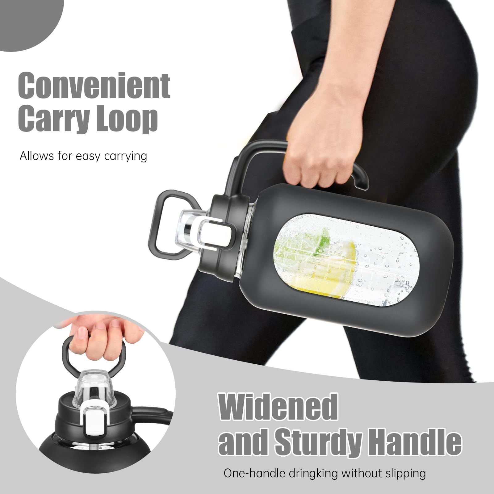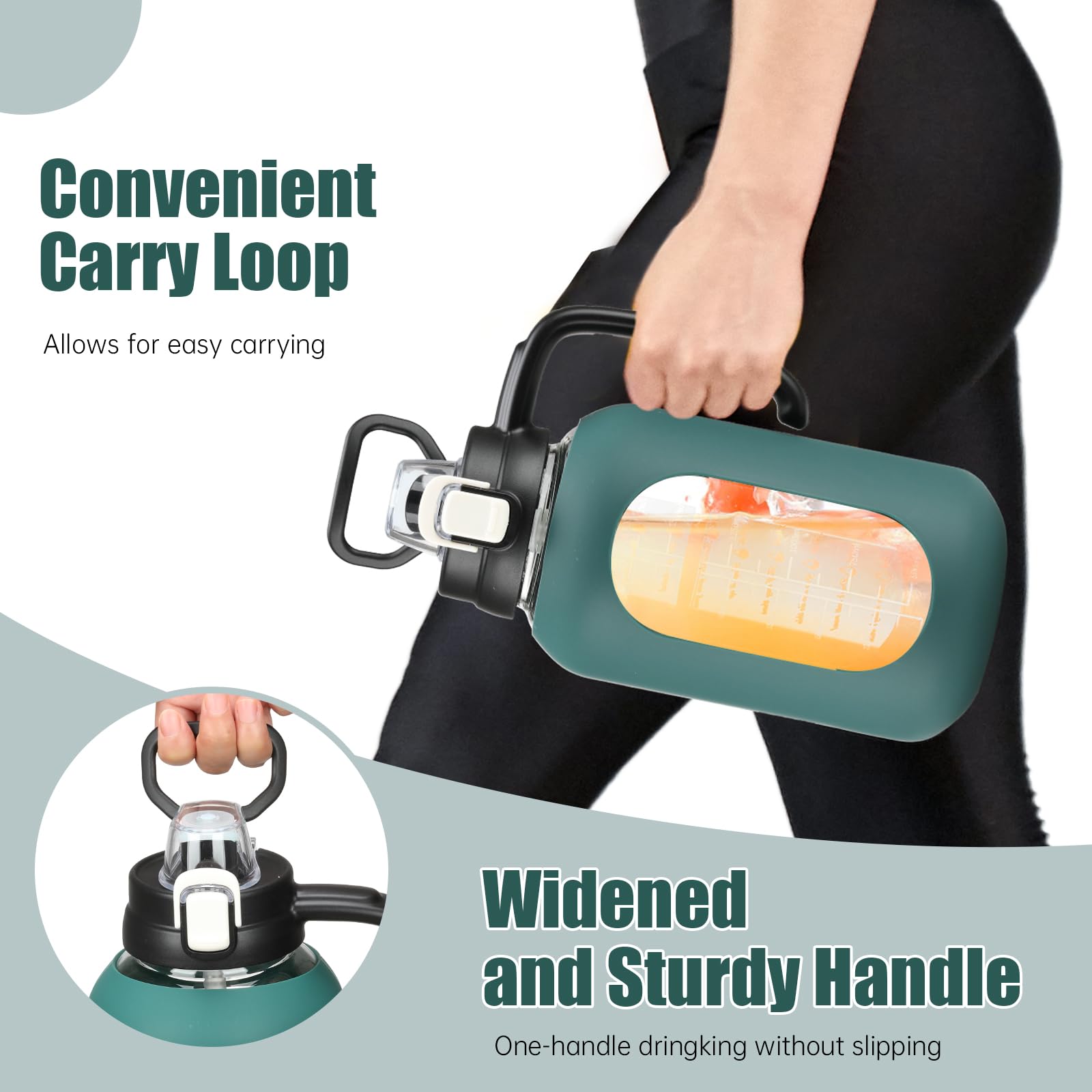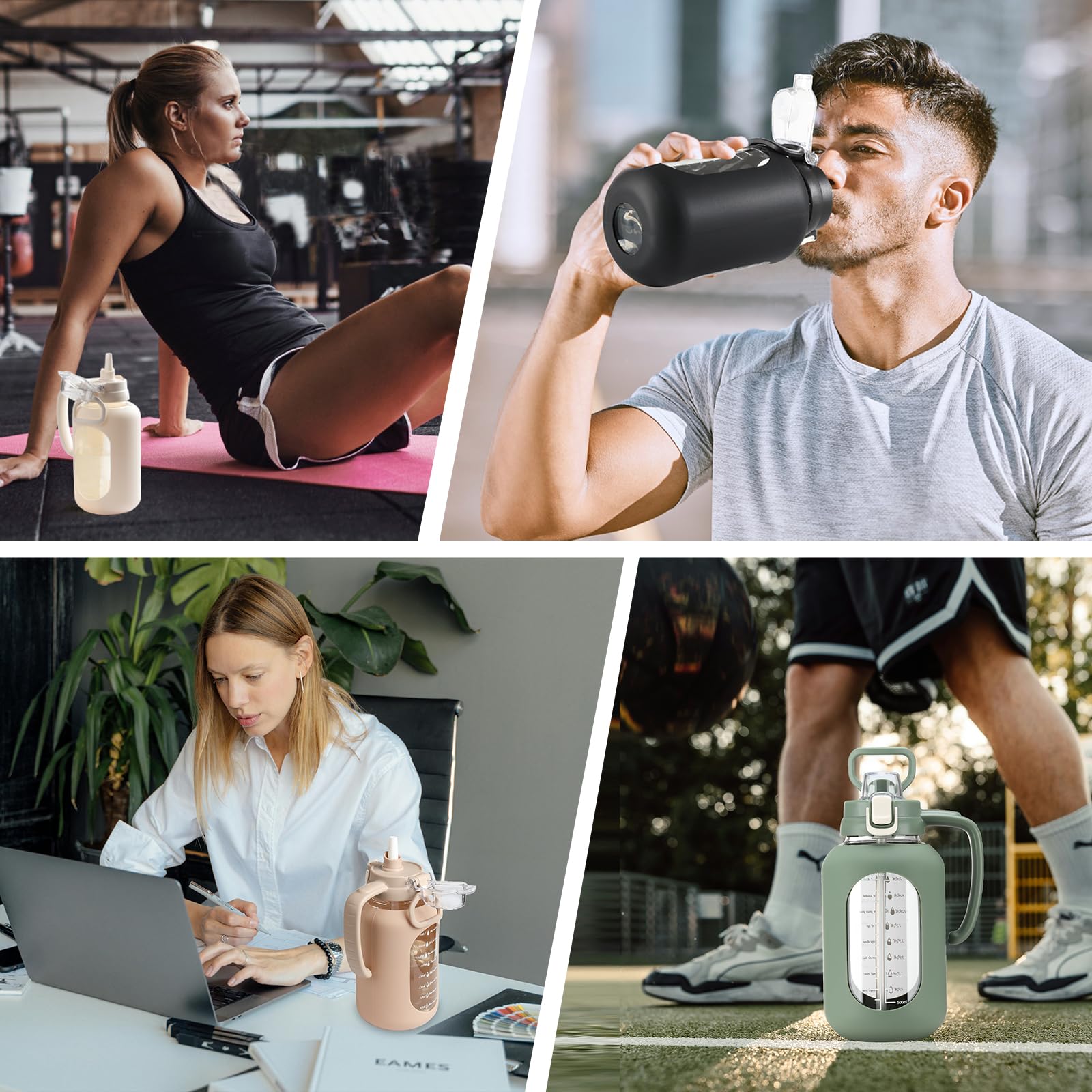 - Glass Water Bottle with Handle:Soft-touch handle on the side or integrated easy grip at the top for maximum comfort on the go. The lightweight body makes Goals perfect for the gym, recreation, hiking, and sports