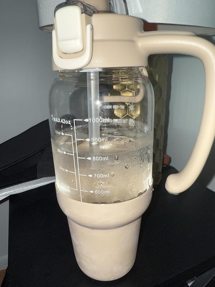 This water bottle is honestly a great buy! The glass thickness is just right and the color is perfect as a nice neutral palette! I love that you could hold it by the handle or the smaller handle on top!