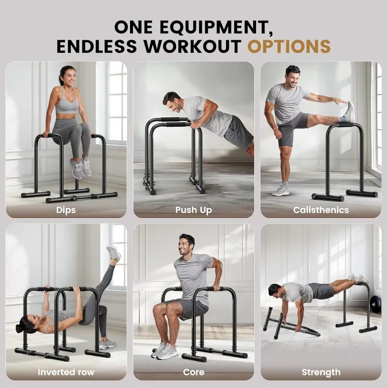 Perfect for dips, push-ups, leg raises, core work, and stretches, targeting chest, shoulders, arms, back, and abs. One piece of equipment, countless workout variations.