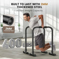 Built from 2mm-thick steel, this parallette dip station supports up to 400 lbs standard or 1200 lbs heavy-duty versions, ensuring durability and strength for all users.