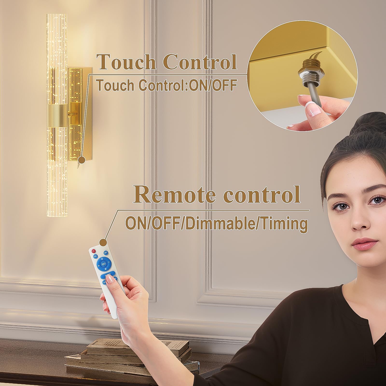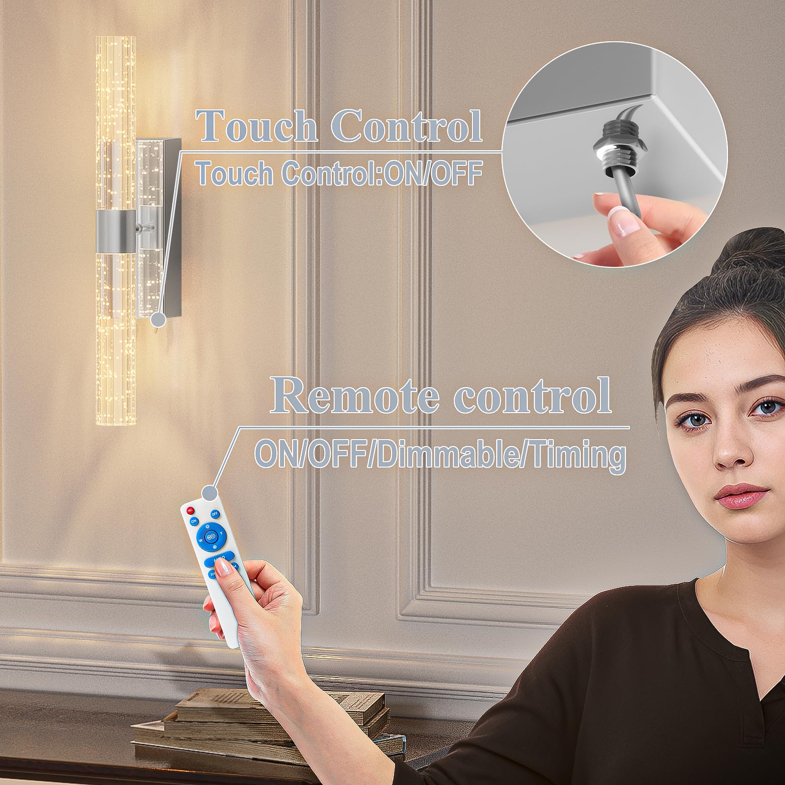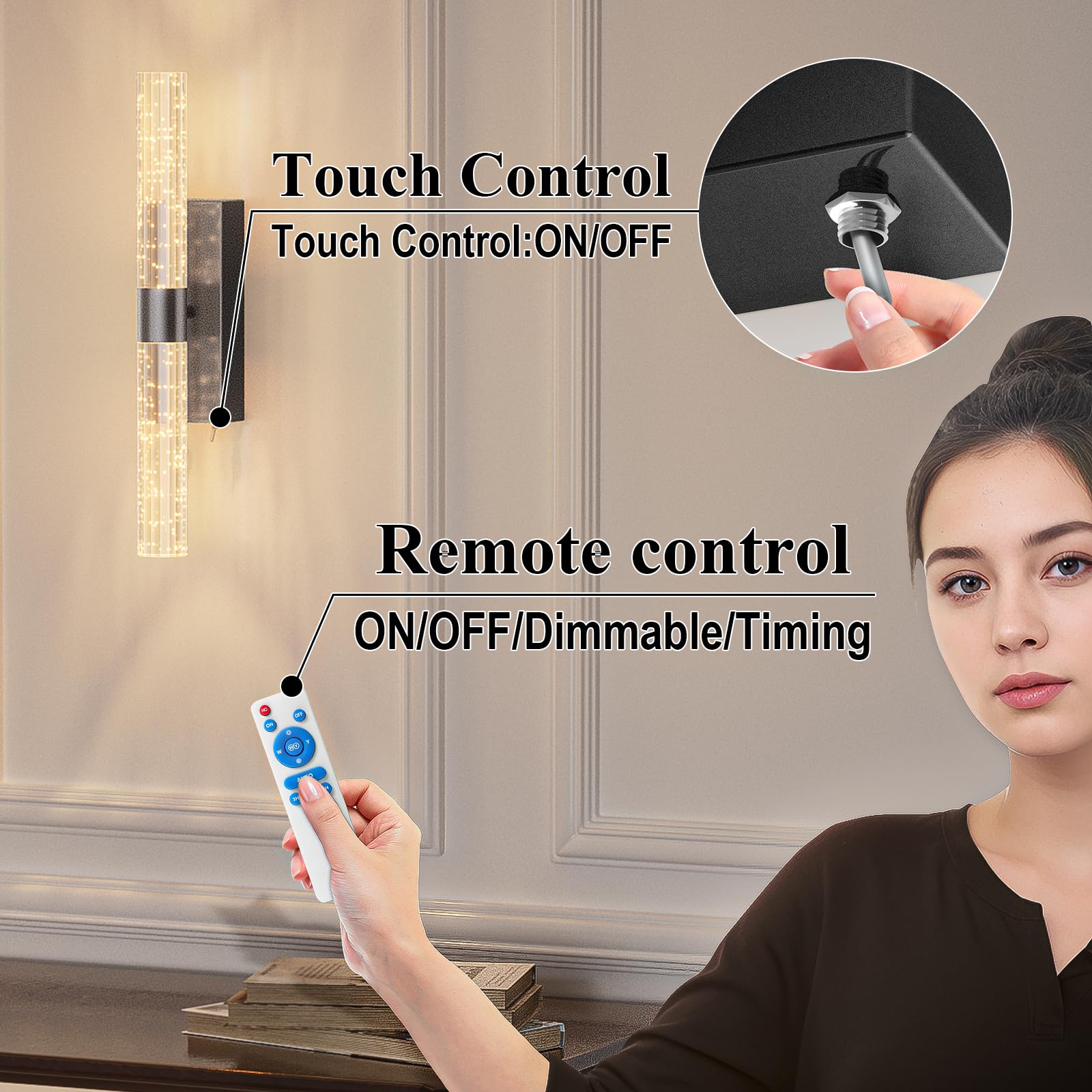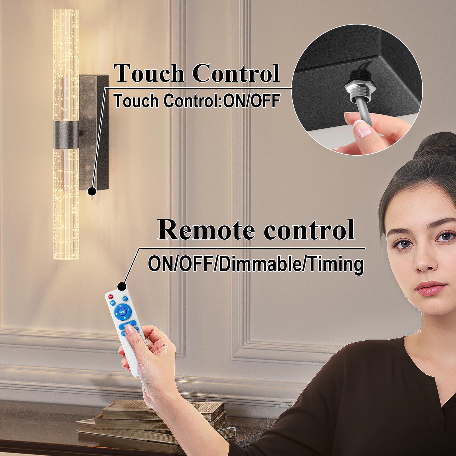 - 【Two ways to control batteries sconces】Rechargeable wall sconce with remote control. Can be turned on/off by remote control or manually by touching the fixture button. With a controllable range of approximately 16 feet/5 meters, it's easy to control the lamp without leaving your couch or bed.
