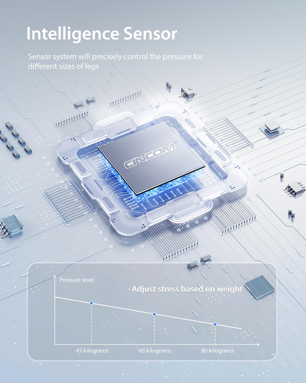 - 【Pro-Level Customization for Any Training Need】CINCOM leg recovery compression system offers 11 adjustable pressure levels (50–150 mmHg), 10 timer settings (15–60 mins), and 3 modes (sequential / circulation / combination). This versatile sequential compression device for legs adapts from stretching to deep muscle relaxation, giving athletes and active lifestyles full control of recovery intensity