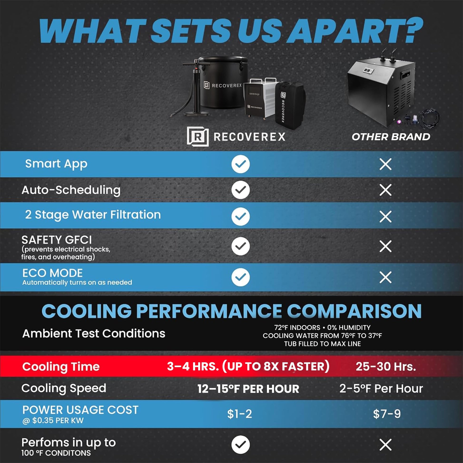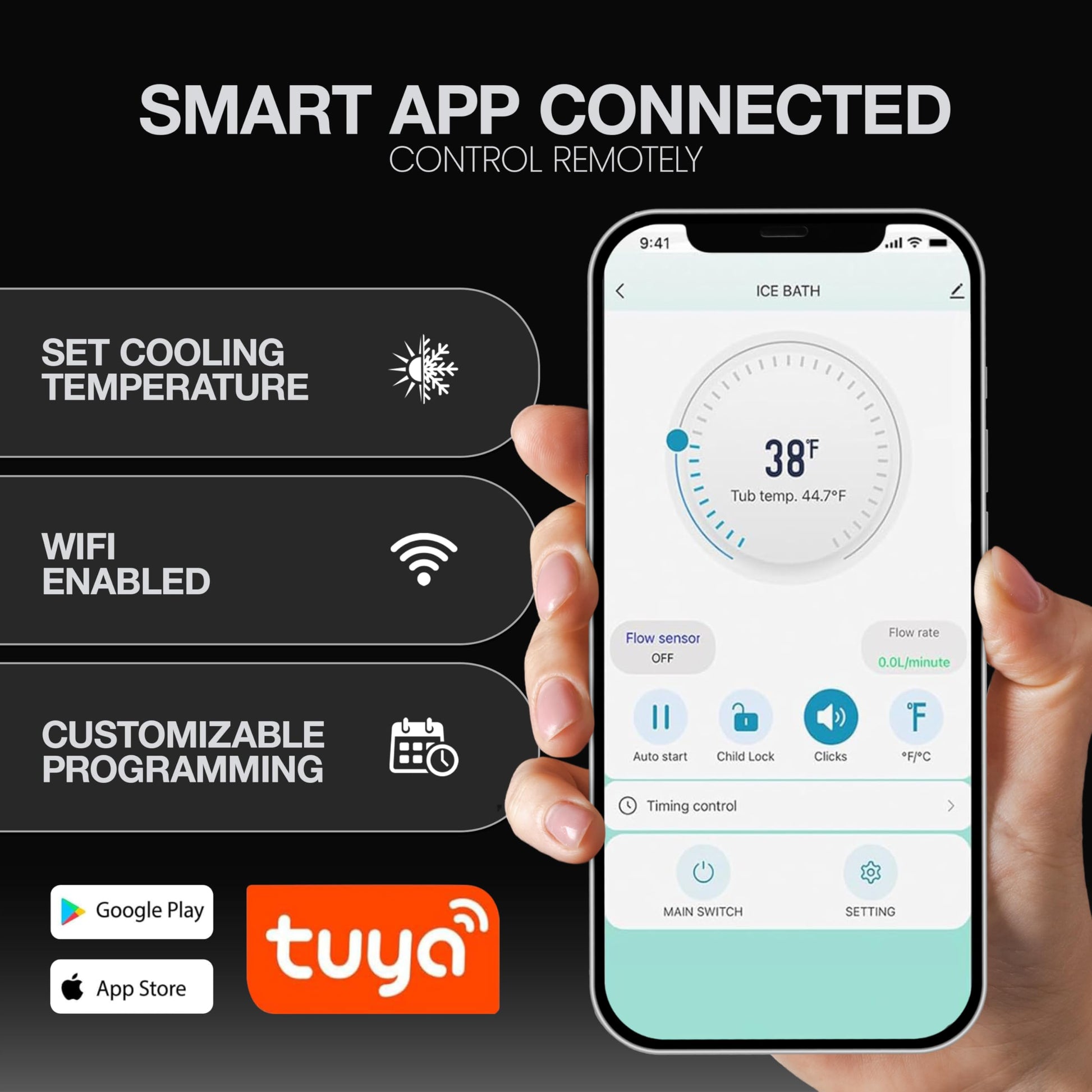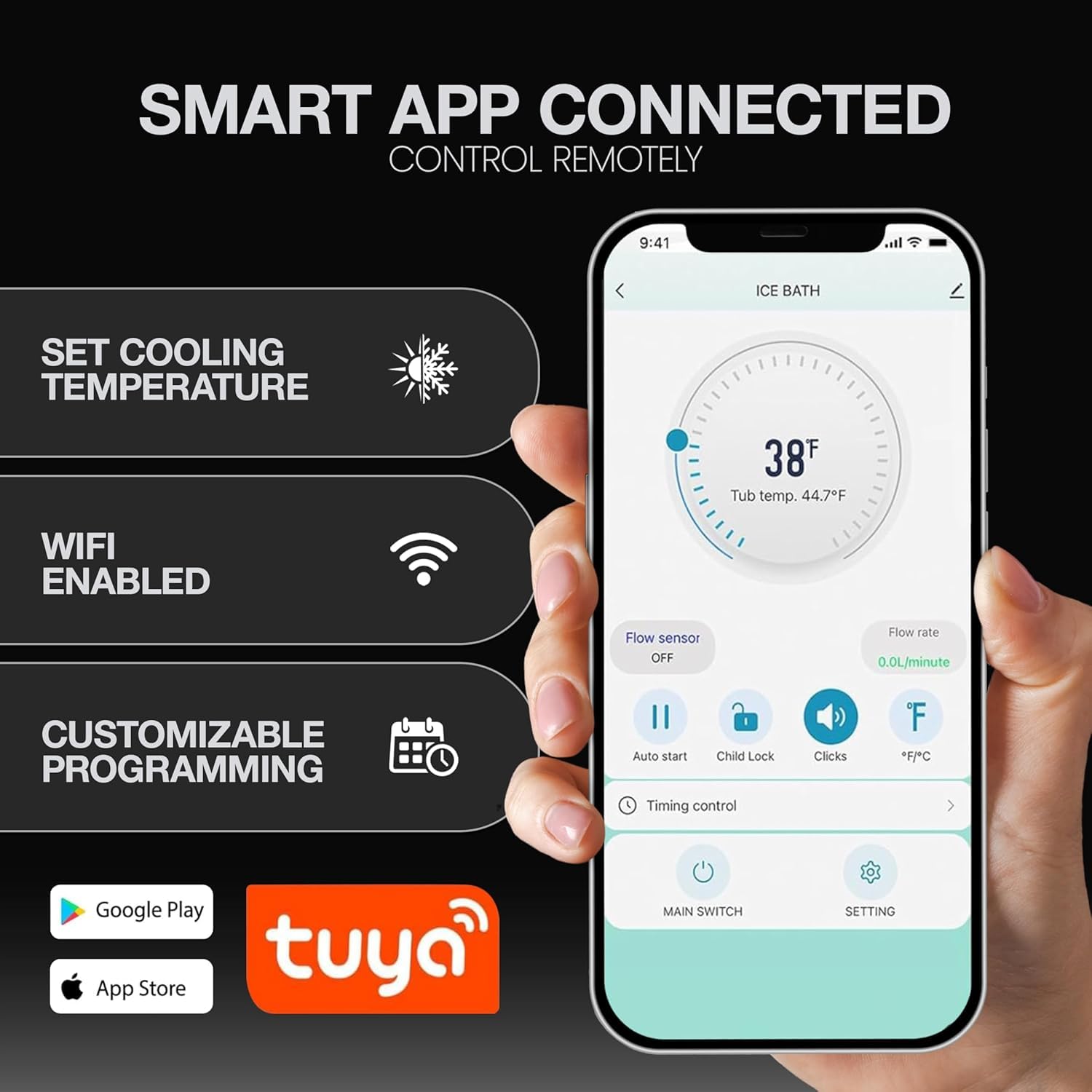 - SMART TEMPERATURE CONTROL – Maintain the perfect ice bath temperature remotely with this WiFi-enabled water chiller for cold plunge. Designed for AC100-130V, 60 Hz power sources, it delivers precise cooling for an optimal cold plunge experience. Using incompatible voltages may cause damage and void the warranty.