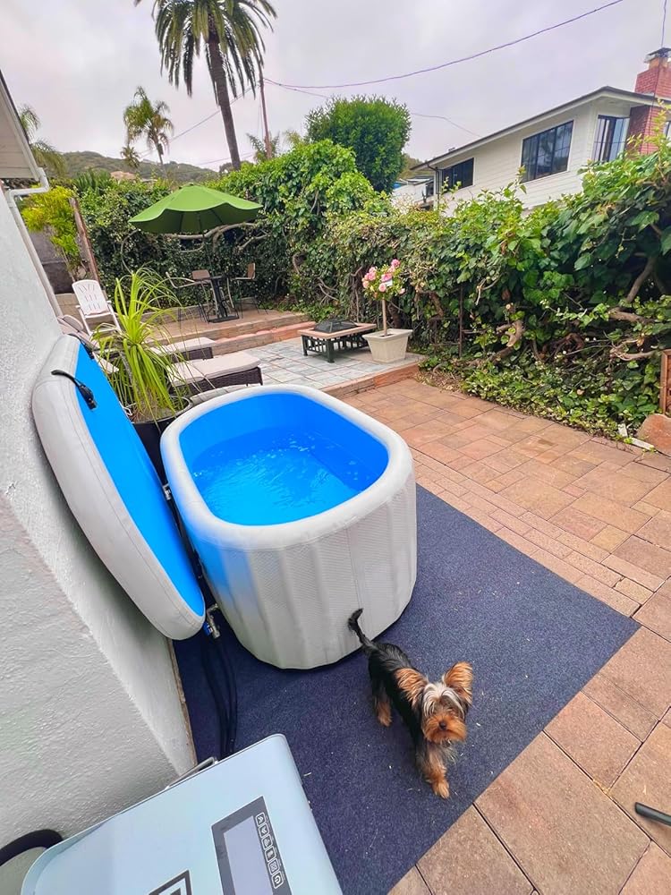 - MILITARY-GRADE DURABILITY: Designed with high-quality, UV-resistant canvas, this portable cold plunge tub is made for long-lasting performance. Its IPX4 water-resistant construction adds extra durability, while the quick 15-minute inflation, carry bag, and built-in wheels allow for easy setup and transport. For optimal use, store indoors when temperatures drop below 36°F.