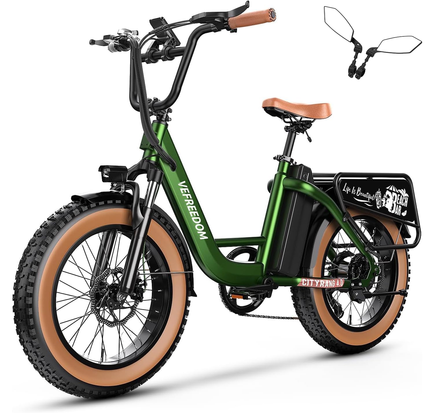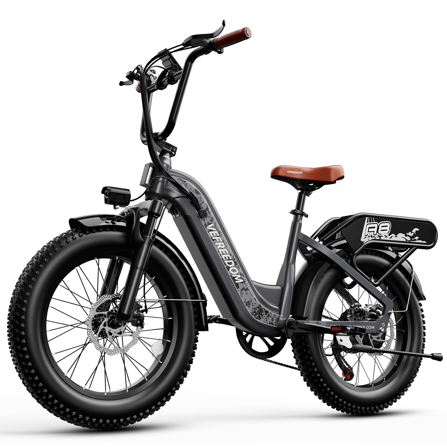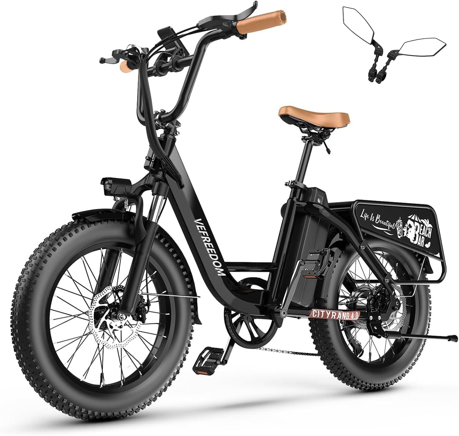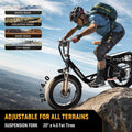 - 𝐄𝐫𝐠𝐨𝐧𝐨𝐦𝐢𝐜 𝐒𝐡𝐨𝐜𝐤-𝐚𝐛𝐬𝐨𝐫𝐛𝐢𝐧𝐠 𝐒𝐲𝐬𝐭𝐞𝐦: Featuring Front Suspension and Dual Disc Brakes: Equipped with 2 front fork spring shock absorbers and 2 puncture-resistant 20‘’*4.0 fat tires, , providing outstanding shock absorption performance. Combined with front and rear mechanical disc brakes and the EABS system, you can enjoy a comfortable riding experience and powerful braking even on steep slopes, rugged terrain, or other extreme terrains.