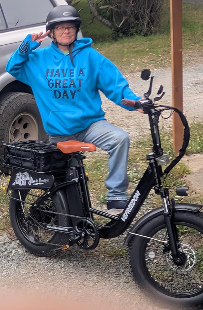 Delivered Aug 26, my husband assembled bike on Aug 28, 2025. I also purchased mirrors and a rear basket. Found a DOT certified helmet in a pile of unused bike helmets, I might trade later or buy a new one later. It was easy to pedal alone while the battery was charging. My1st trip was the PO and store. Carried home a bag of dog food. From there I got the itch to go exploring & learning how to use the bike. I was so happy & excited how easy & fun this bike was. So much I did a FB Live while riding one handed! The bike is intoxicating I rode all over town, to the beach watched the sunset, up the hill to the cemetery for an awesome view! Bike handled perfectly! I'm already planning where to go tomorrow. I put 19.9 mi one handed while filming FB Live. In 💕. Trying to figure out a name... So far it's FREEDOM, not sure it's a he or she yet. I'm recommending this to my 16 yo nephew who recently got hit by a car & has a broke ankle. No skateboarding for him BUT this bike. I'm glad my original ebilke order failed! This bike is the bees knees. I'm more than satisfied with this purchase!!! Me with my Freedom ;)
