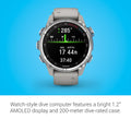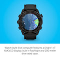 - Advanced, watch-style dive computer features a stunning 1.4” AMOLED display, scratch-resistant sapphire lens, 51 mm titanium bezel and optional titanium bracelet