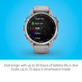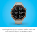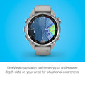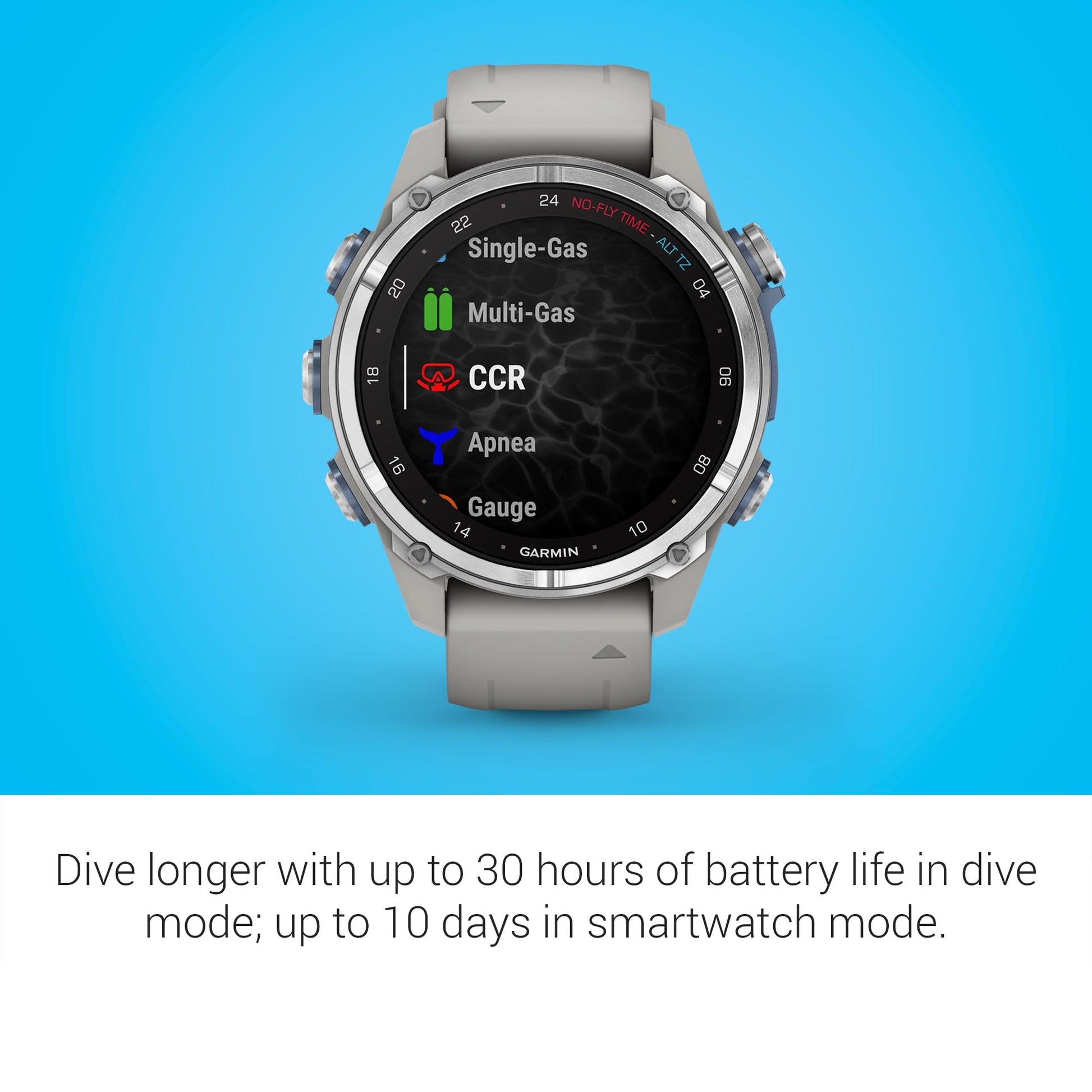 Discover a deeper connection with the Descent™ Mk3i watch-style dive computer. It features multiple dive modes plus SubWave™ sonar technology for diver-to-diver communication via preset messages (available with software v.15.70 or later). The device also supports monitoring of tank pressures and depth for up to eight networked divers, when paired with the Descent™ T2 transceiver (sold separately). A built-in LED flashlight keeps you going in low-light conditions, above or below water. Purpose-built specifically for divers, the Descent Mk3i dive computer combines a bright 1.4” AMOLED display with scratch-resistant sapphire lens, 200-meter dive-rated case and metal leakproof inductive buttons. DiveView™ maps offer bathymetric depth contours and more than 4,000 dive sites to help you find where to dive and get oriented. Plus, a dive readiness tool, developed by Garmin, shows how lifestyle factors such as sleep, exercise, stress and jet lag can affect your body’s overall preparedness for diving — so, ultimately, you can make better-informed dive plan decisions (data presented is intended to be a close estimation of metrics tracked). This dive computer is designed to help maximize your preparation for the physical and mental challenges of diving. When you’re ashore, built-in sports apps help you stay on top of your fitness, while Garmin Pay™ contactless payments, music storage and smart notifications keep you connected (compatible smartphone required).