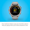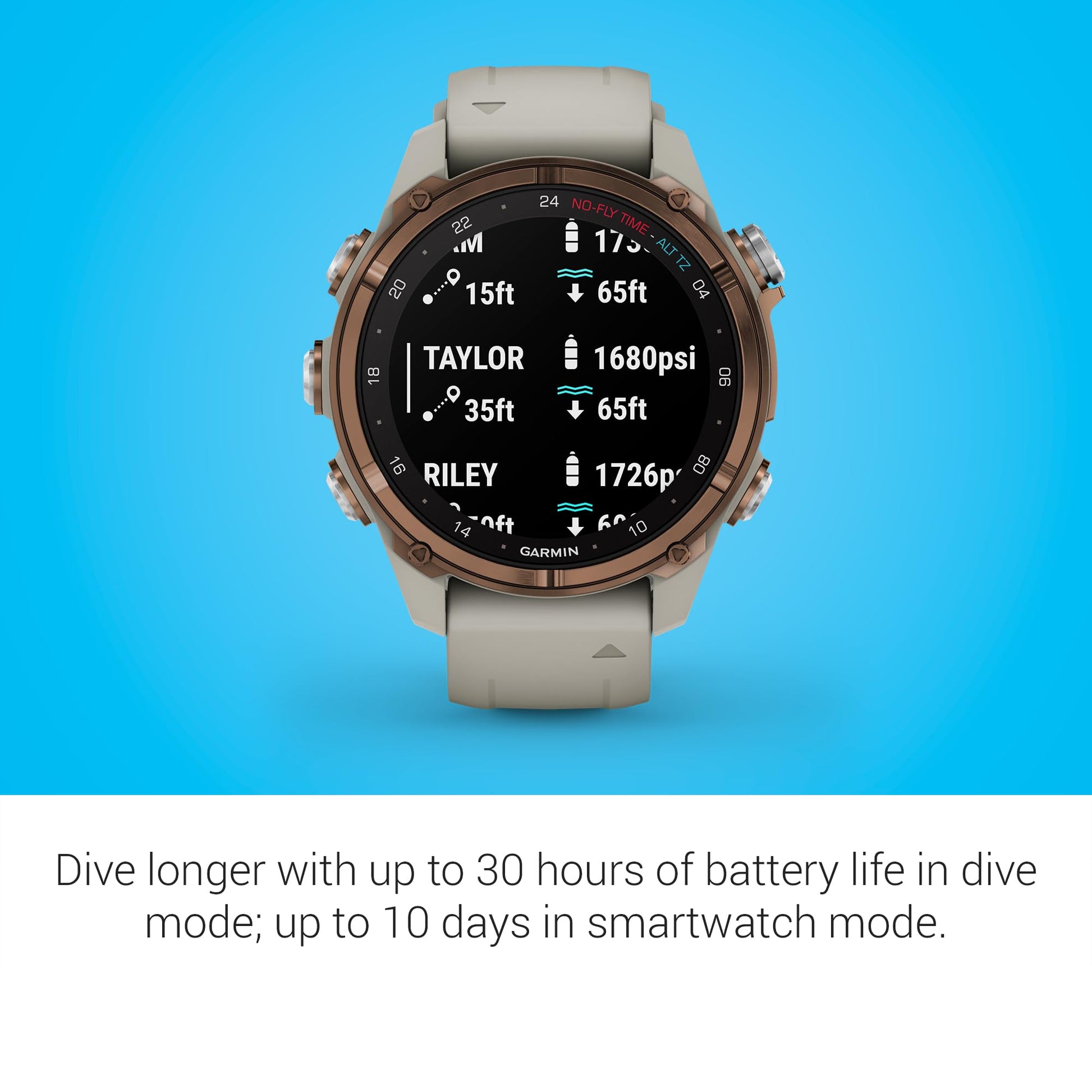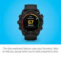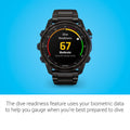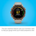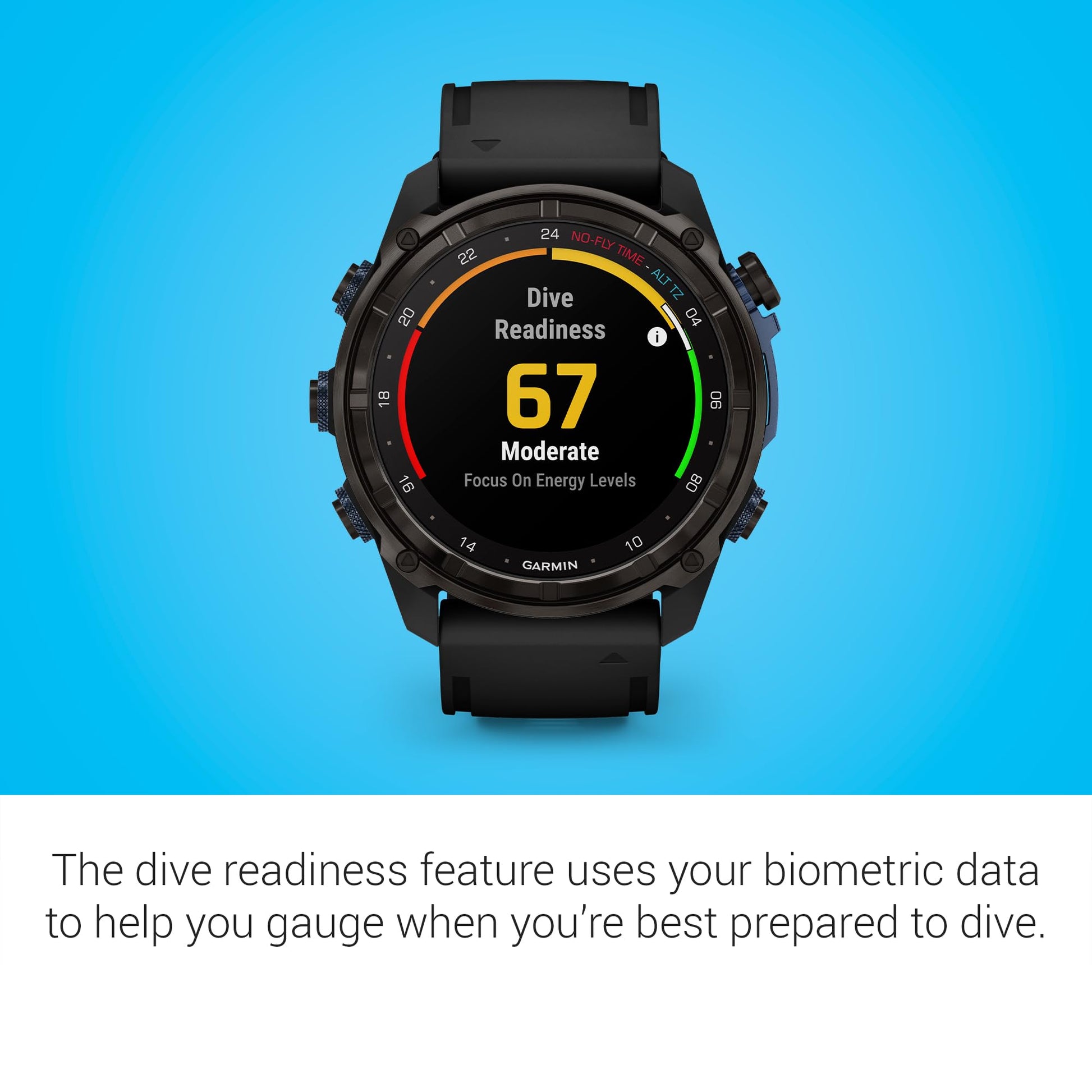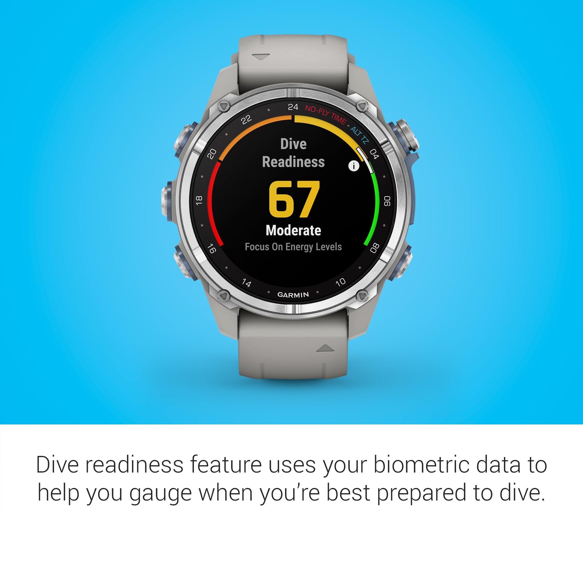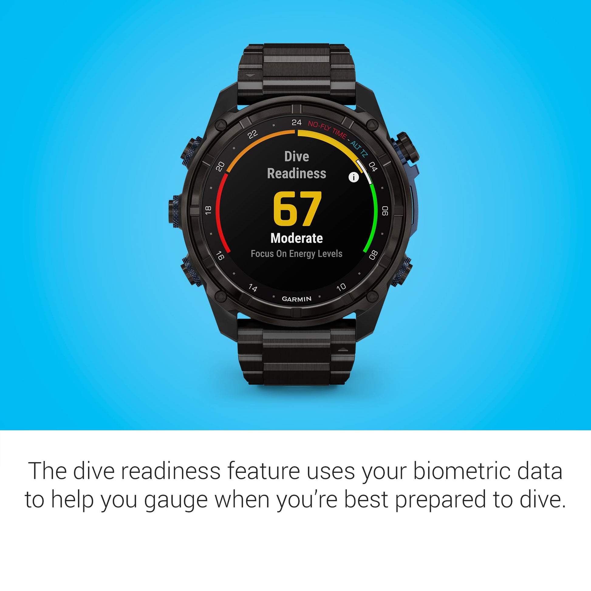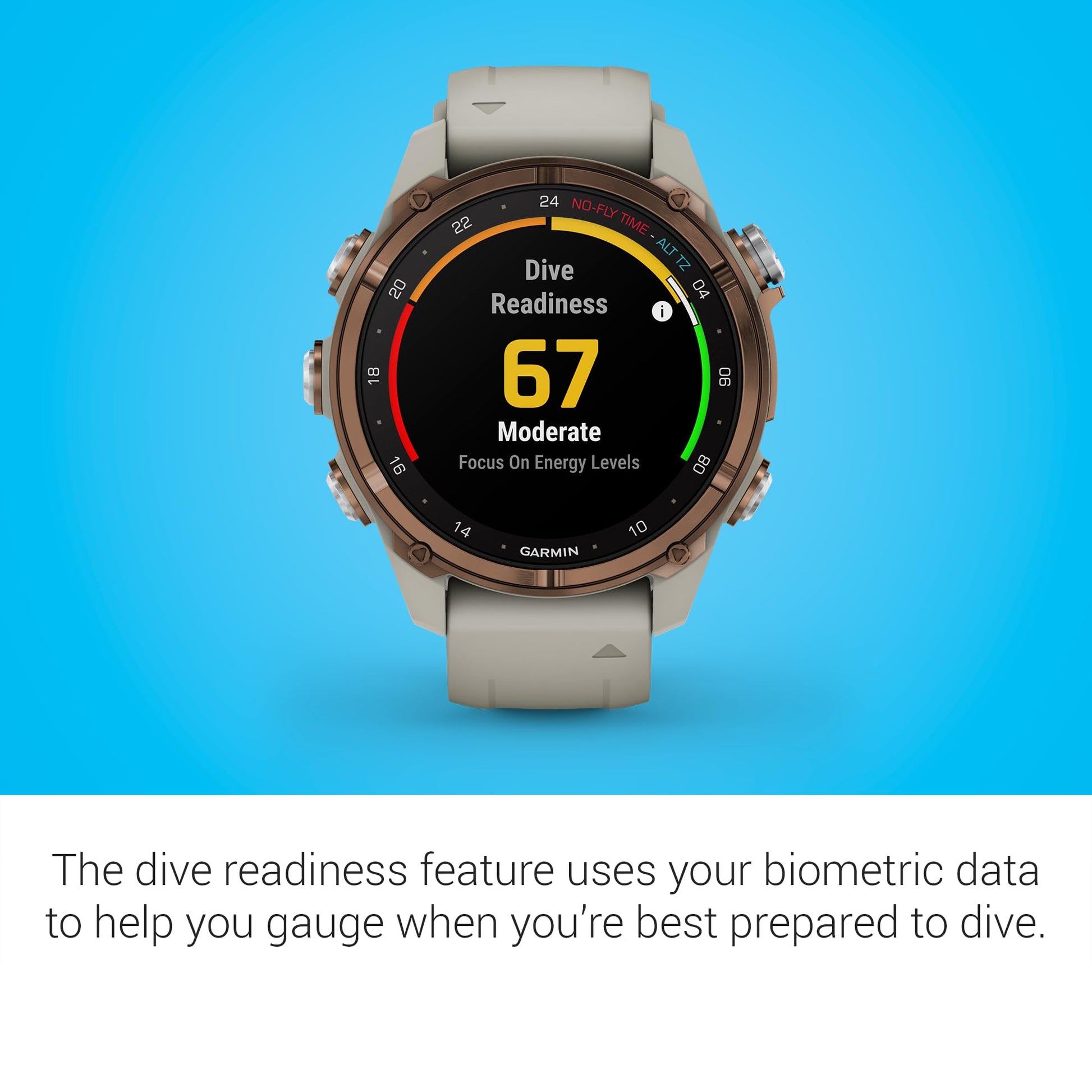 - A dive readiness tool, developed by Garmin, shows how lifestyle factors such as sleep, exercise, stress and jet lag can affect your body’s overall preparedness for diving — offering guidance that can help you make better-informed dive plan decisions (data presented is intended to be a close estimation of metrics tracked)