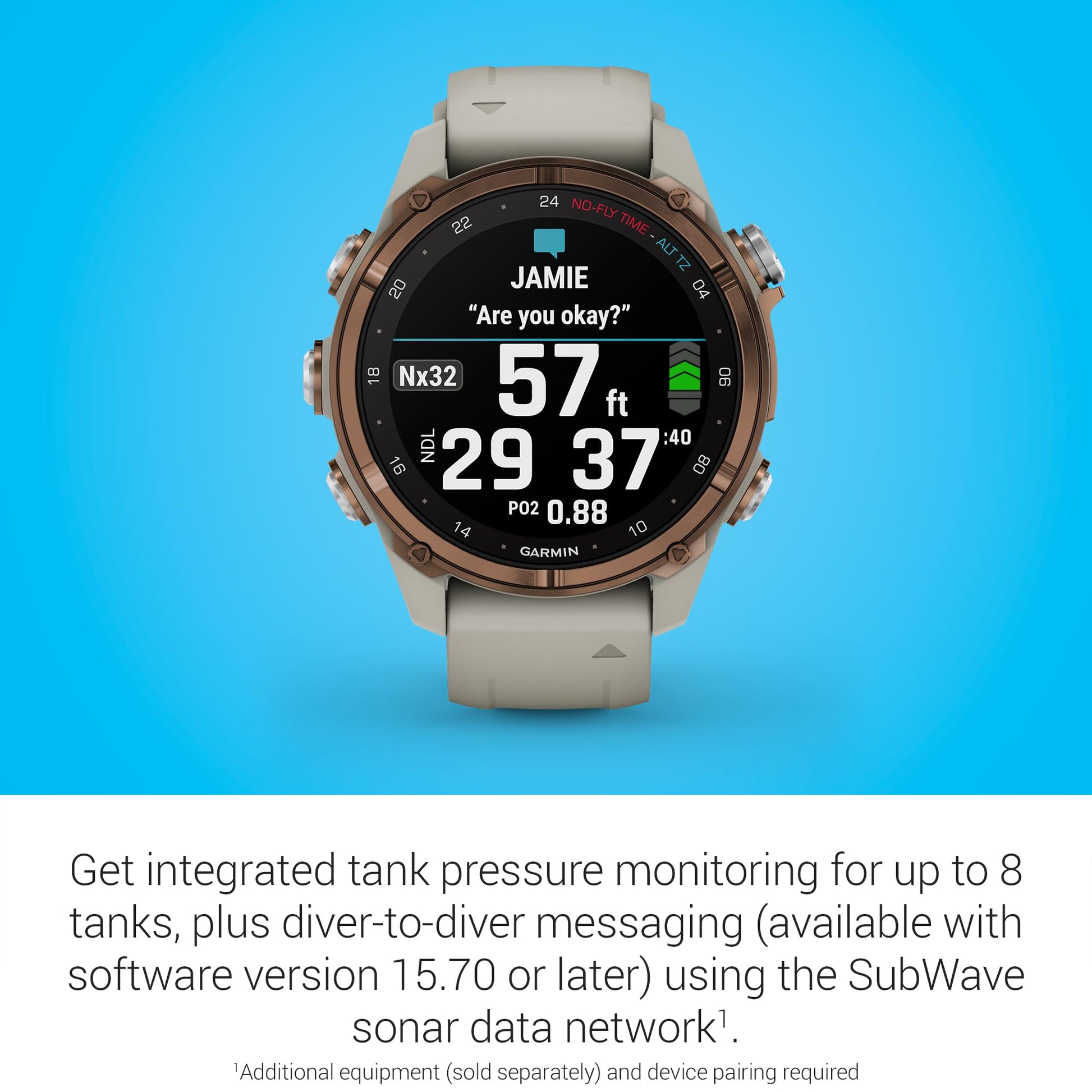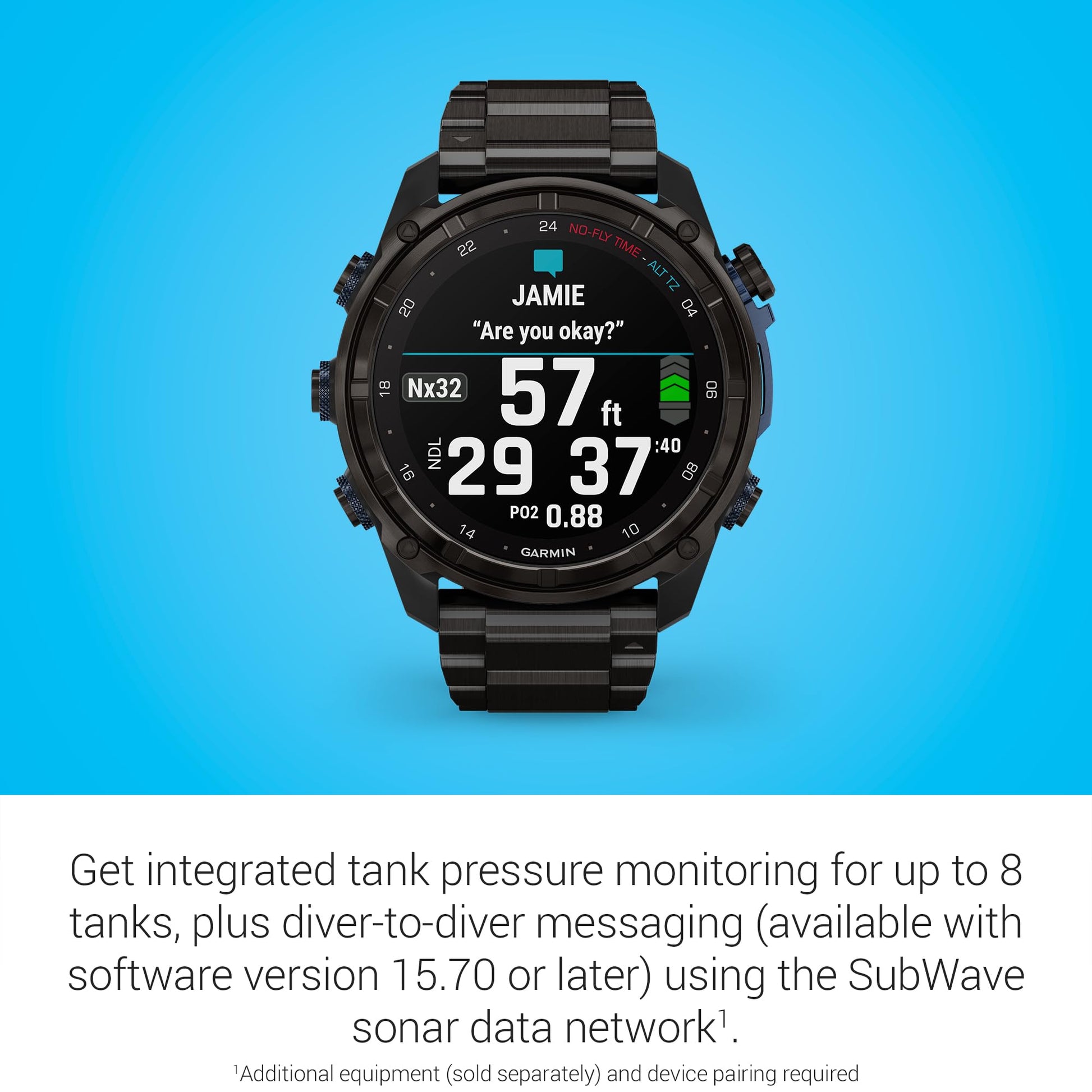 - Enhanced SubWave sonar technology provides the ability to exchange preset diver-to-diver messages up to 30 meters (available with software v.15.70 or later) as well as monitor tank pressures and depth for up to eight divers, within a range of 10 meters when paired with the Descent T2 transceiver (sold separately) for group dive support