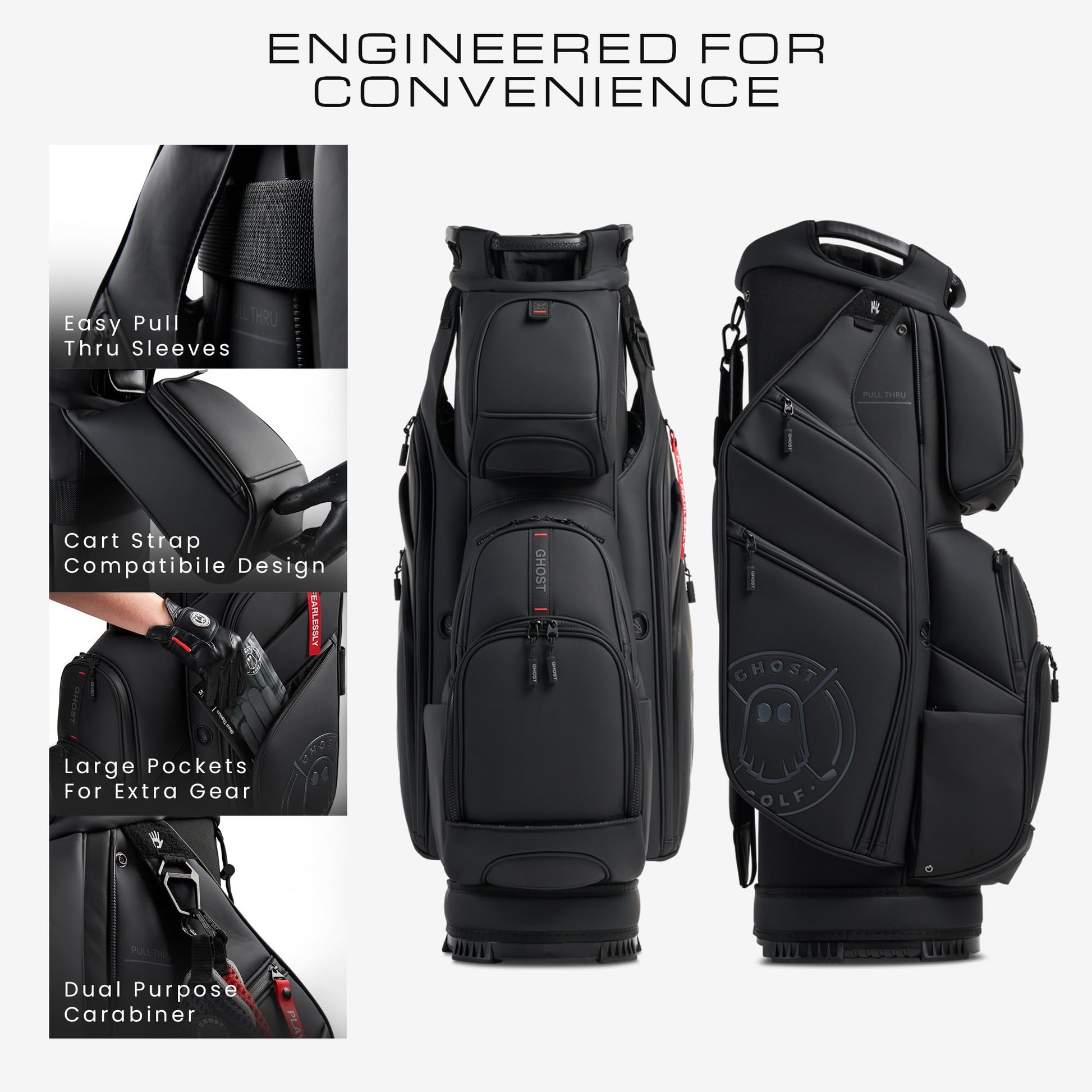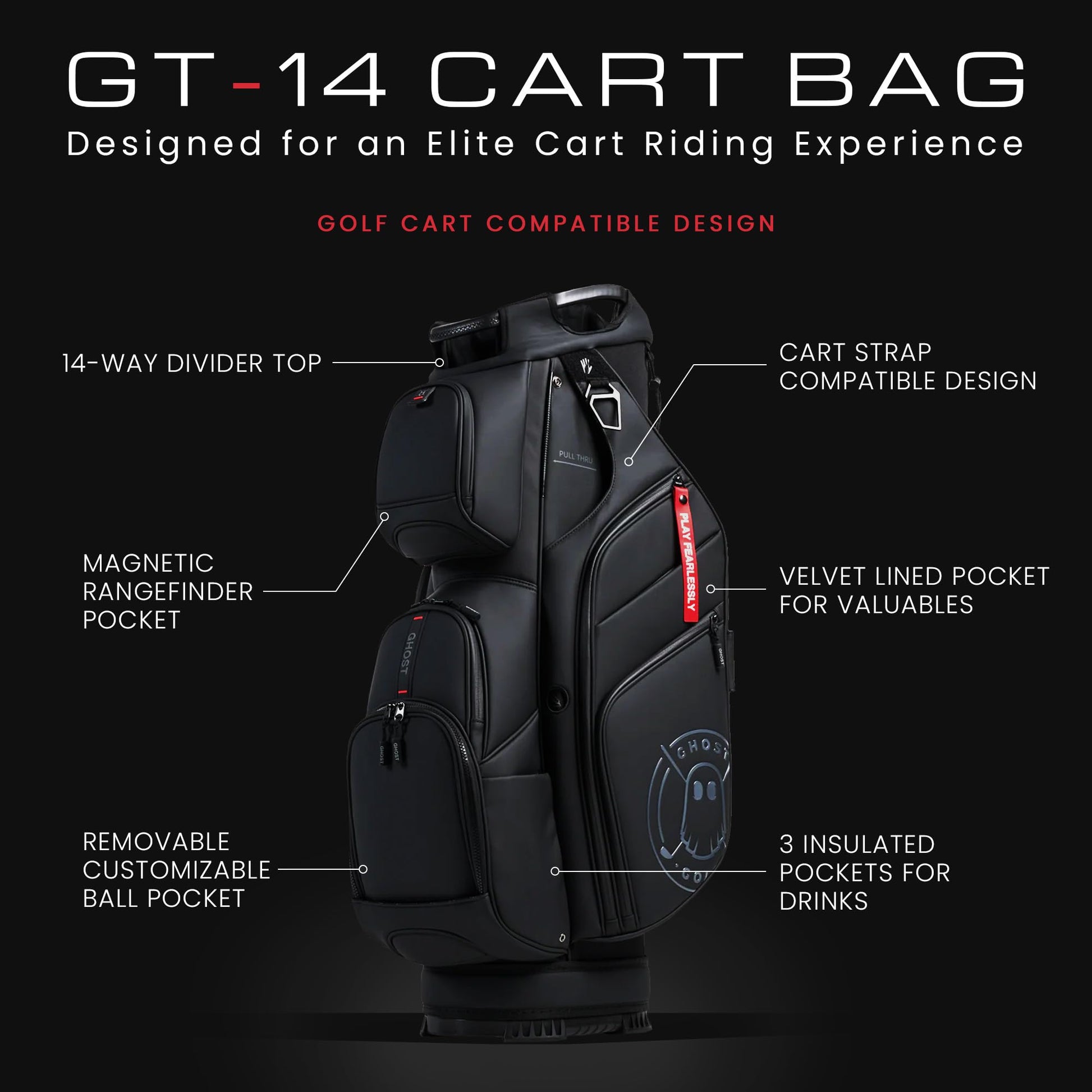 - Designed for an Elite Cart Riding Experience: The Ghost Golf GT-14 Cart Bag was crafted with a cart strap compatible design to provide the ultimate golf cart experience. Featuring 14 full-length dividers, our bag offers efficient organization and protection for your gear. Compatible with any golf cart. Color: Katana.