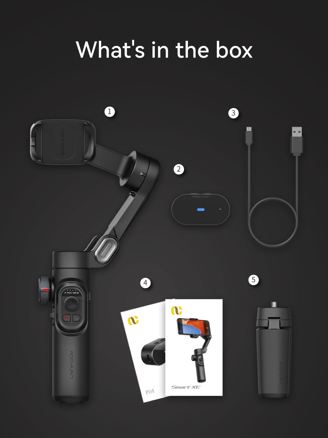 - Portable and Foldable: Our Smart XE gimbal adopts a foldable design, folded size is 6.4*4.3*2.1 inches, and the expansion size is 10.7*4.9*2.6 inches, and weight is only 0.77 pounds, 0.55 pounds payload. No matter where you go, you can put the gimbal in your pocket or bag at any time. Whether traveling or daily life, you can capture beautiful moments at any time. Package and Support. Includes AOCHUAN SMART X Pro gimbal (phone not included), tripod, USB-C charging cable and user manual. Each AOCHUAN gimbal is granted with 12-month return