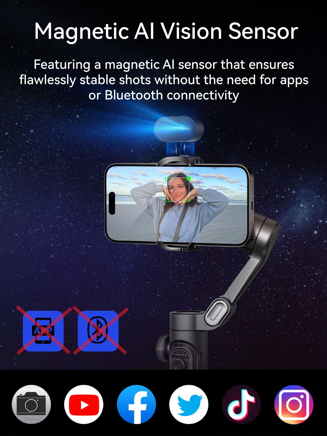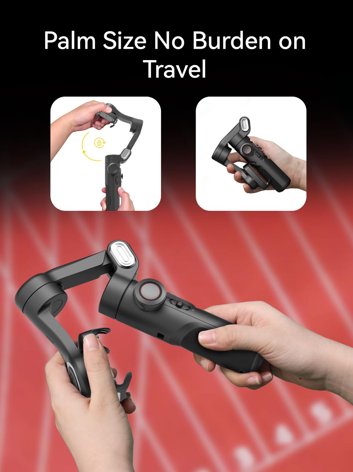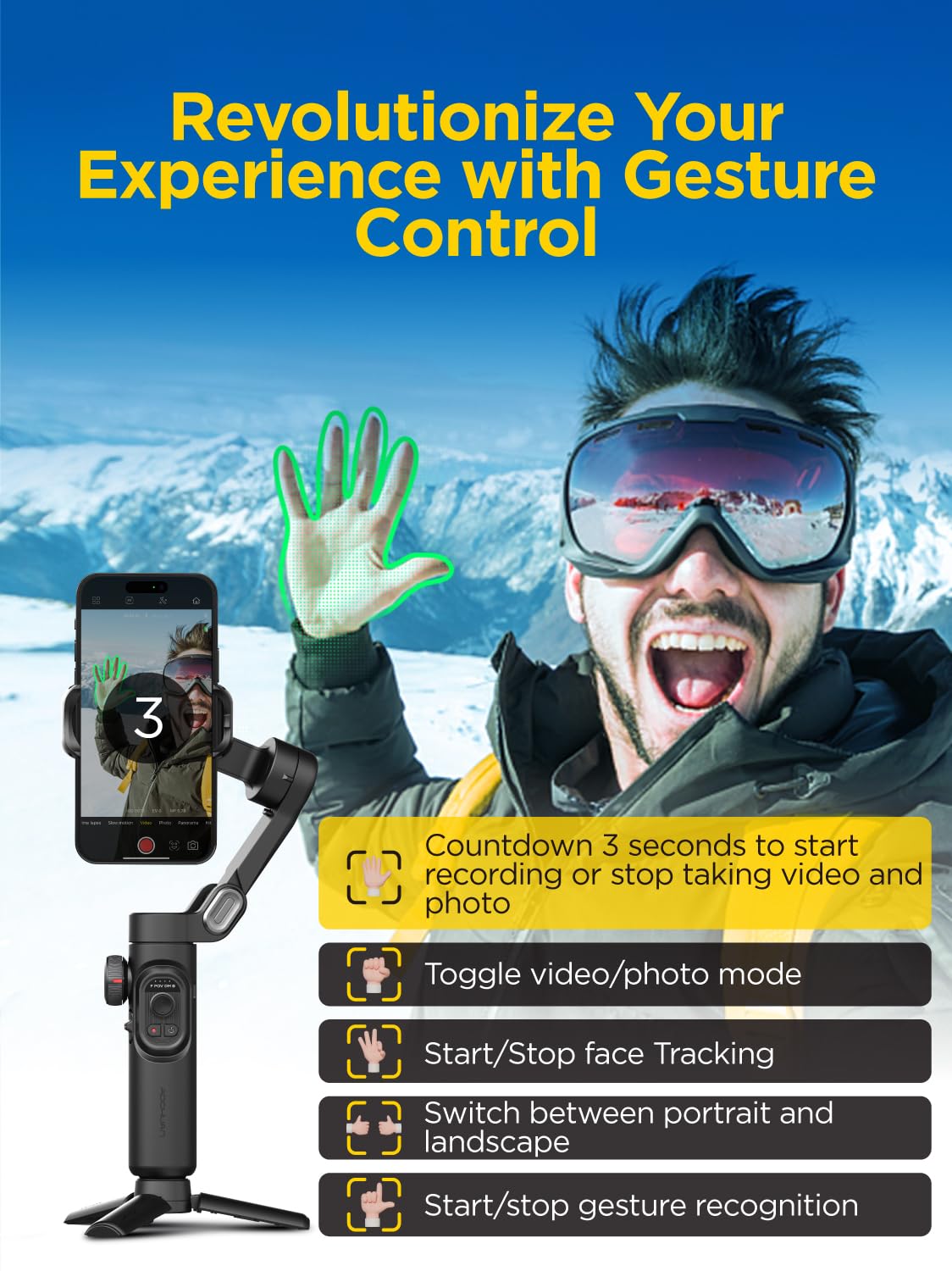 - Smart Tracking 6.0: Our gimbal has a built-in tracking system that can accurately recognize and track. Face tracking, body tracking, object tracking and third-party live tracking four modes to meet your different shooting needs. Just click on the target object on the screen, the gimbal will automatically track and shoot, allowing you to take more creative photos. Moreover, the gimbal with gesture control function, capture your most creative shots effortlessly with intuitive gesture controls. Simply gesture accordingly, and our Phone gimbal will respond, ensuring you stay the center of attention