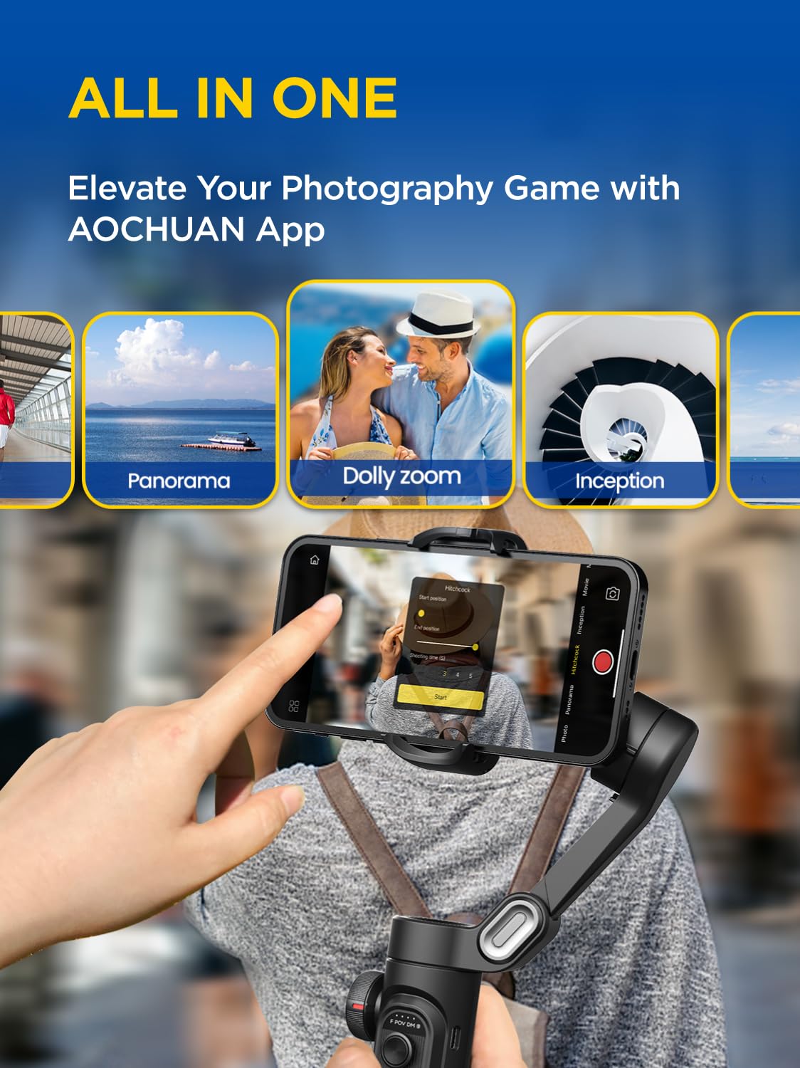 - Wide Compatibility: The gimbal stabilizer has a wide range of compatibility, Smart XE gimbal is compatible with all iPhone and Android phones under 7 inches, the weight of 0.62 pounds and the length of 6.3 inches, width of 3.5 inches, thickness of 0.4 inches. You can download our APP without the gimbal on your Apple and Google store by searching "AOCHUAN" to check if it's available on your phone or not, and discover all functions like Hitchcock, Inception, slow motion, time lapse, panorama etc...