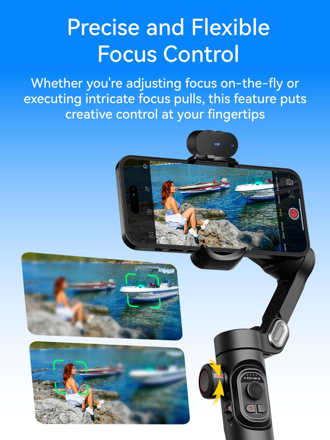- Smart 8.0 Anti-Shake: Our gimbal uses leading anti-shake technology to provide professional anti-shake performance, which can eliminate shaking during movement and ensure that the photos and videos you take remain stable. Gimbal is suitable for any scene and captures every wonderful moment. The gimbal stabilizer for smartphone is equipped with a professional focus wheel and zoom slider, supports real-time and accurate focus and zoom adjustment. And also easily shoot professional portrait and landscape videos with the gimbal by one click