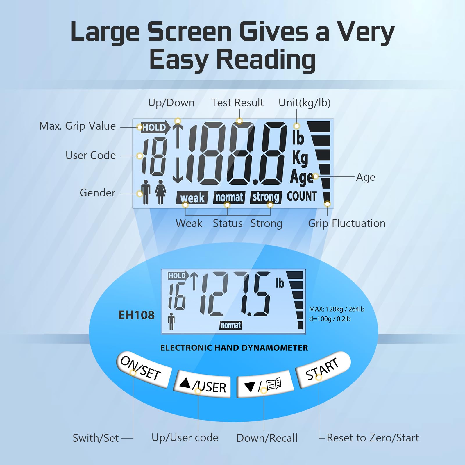- ๐๐๐๐ข๐๐ข๐๐ง๐ญ ๐๐ง๐ ๐๐๐ฌ๐ฒ ๐ญ๐จ ๐๐ฌ๐: This lightweight grip strength tester features an easy-to-read display; adjustable handle length fits different hand sizes; more convenient and comfortable than old manual models, which are often hard to read and use