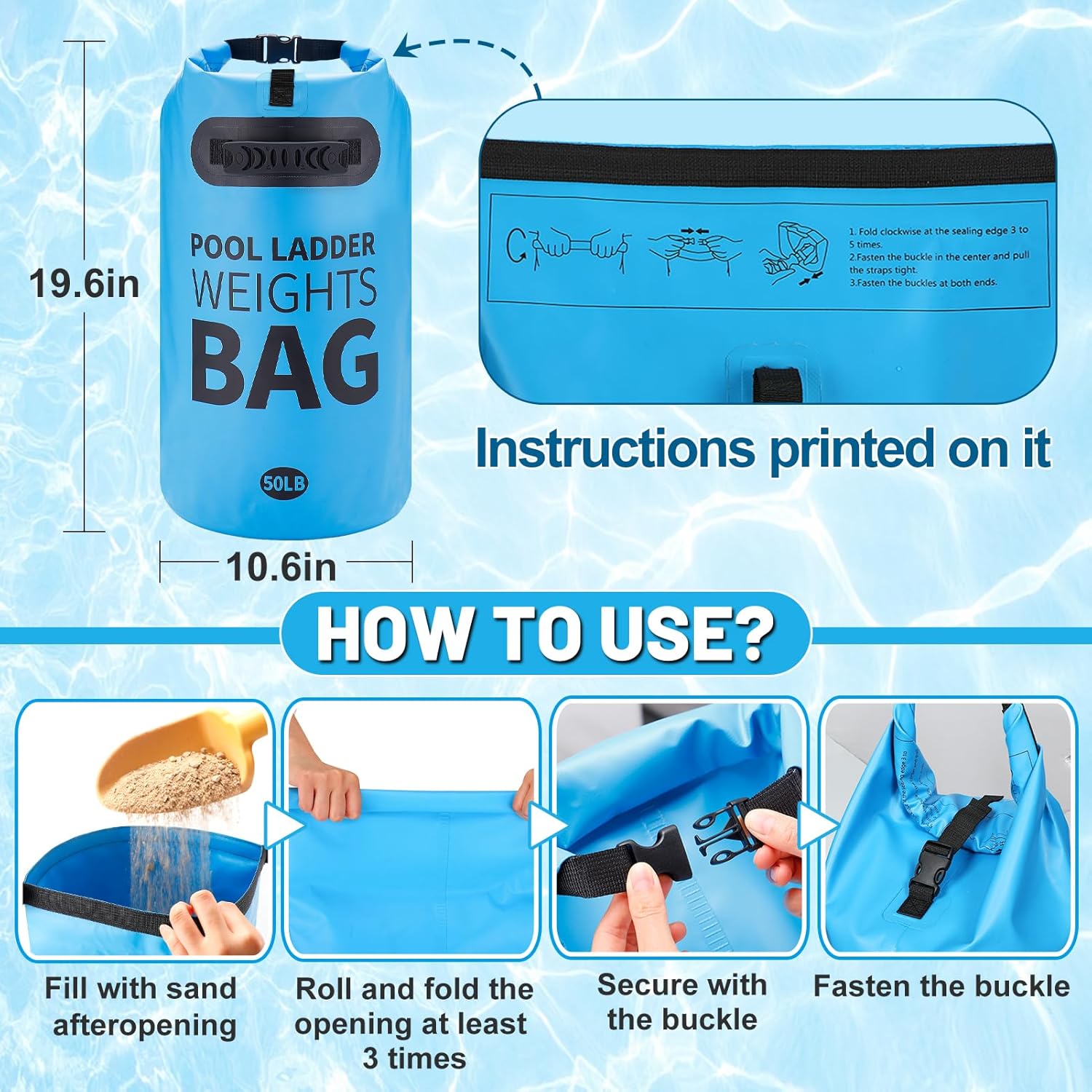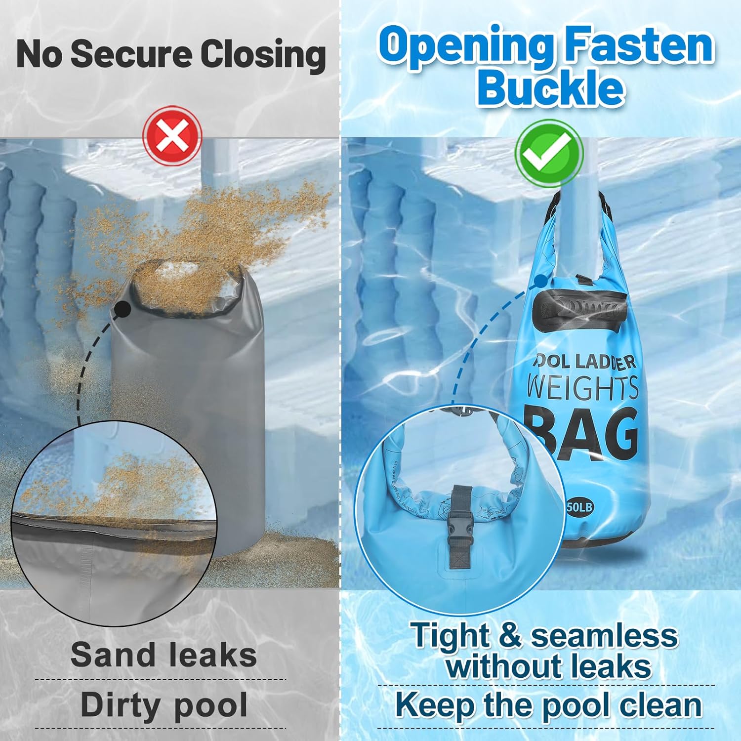 - Easy to Use and Store: When using our swimming pool staircase weight bag, pinch the opening, fold it down 3 to 5 times, and lock the buckles in the center and both ends (instructions are printed on the product). When not used, empty the sand, rinse with water, air dry, fold, and store to save space.