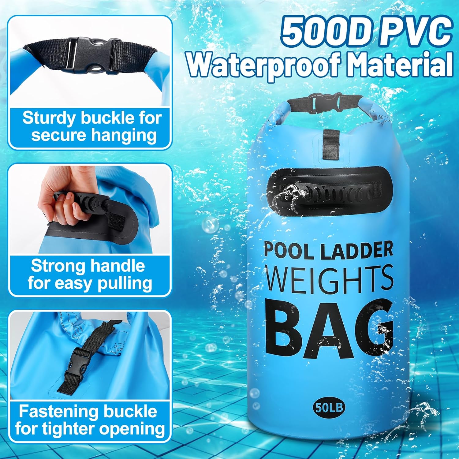 - Heavy Duty Thickened Material: Our pool ladder step weight is made of high quality heavy duty 500D PVC material, which is waterproof, durable, lightweight and easy to carry, stain and scratch resistant, and not easy to break. And the reinforced nylon handle on the product will not easily break. Compared with other plastic and ordinary PVC weight bags, this thickened 500D PVC sand bag can serve your swimming pool for a long time.