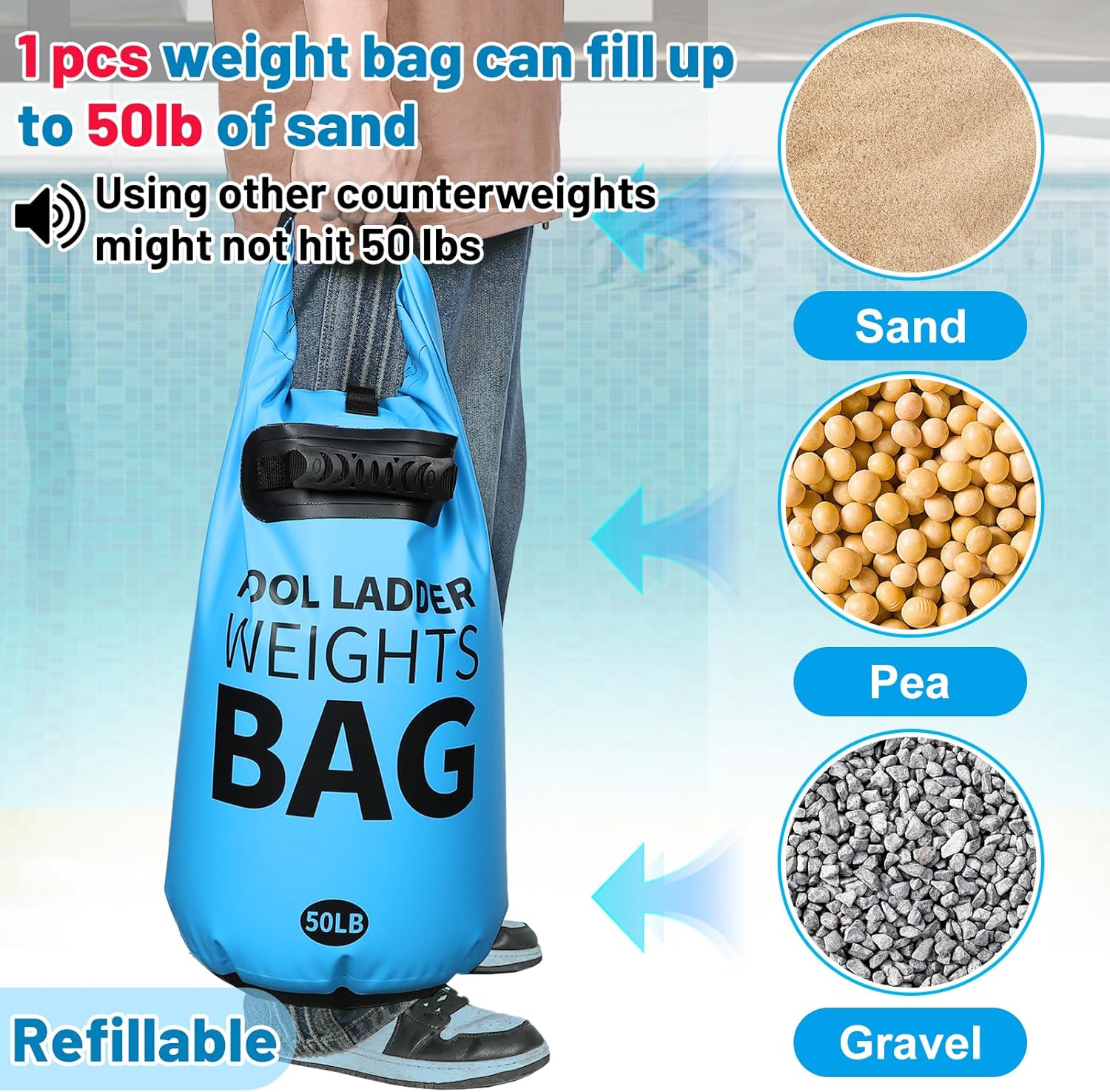 - Easy and Fast Sand Filling: You will receive 2 pcs pool ladder-weight anchors. Featuring a large opening, our pool stairs counterweight anchor allows for quick and effortless sand filling, saving you time and energy. 1 pcs sandbag can hold up to 50 lbs of sand, enhancing the stability of the ladder and preventing any floating or wobbling. Tip: If used to store counterweights other than sand, such as gravel, it may not hold 50 lbs.