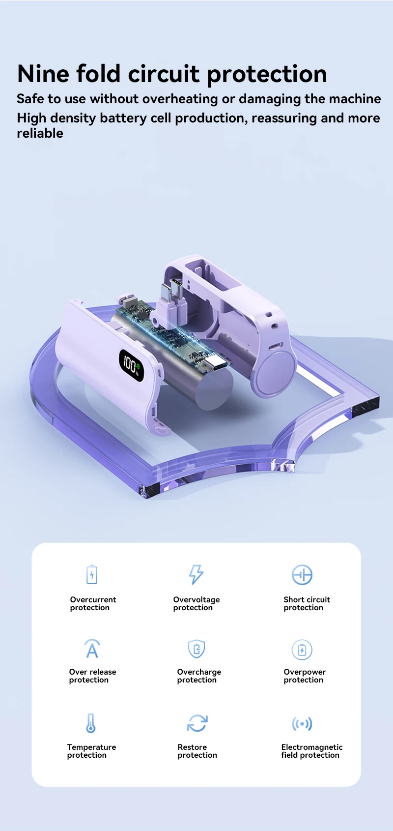 Advanced safety features prevent overcharging, overheating, over-discharging, and short circuits β protecting both your power bank and devices.