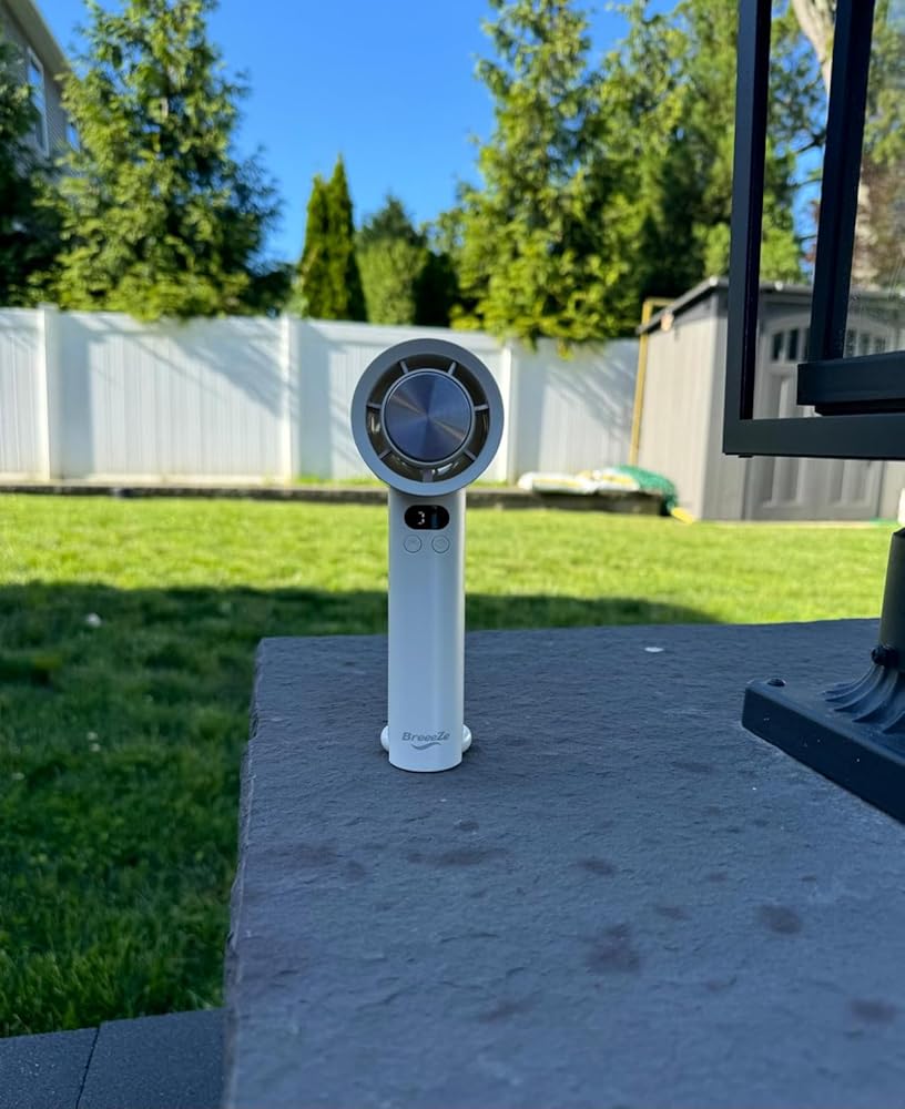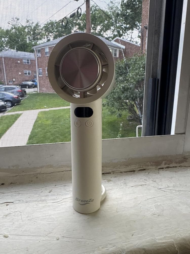 Use as a portable fan on the go or set it upright on your desk for hands-free cooling.