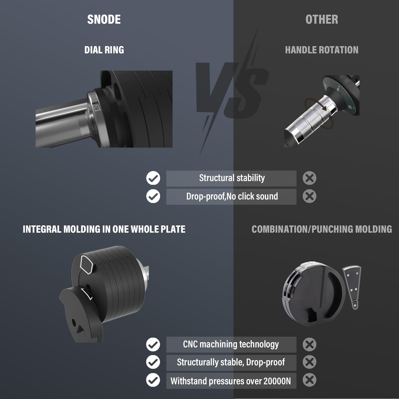 - 【Unique Structure】The grip and the first plate are integrated to ensure that the handle does not shake/rattle. How we make it drop-Proof: When dropping, the stress-bearing is always on the first plate which we already make it really durable. Also the dual design of the telescopic rod and dovetail groove ensures the plates won't fall off during workout.