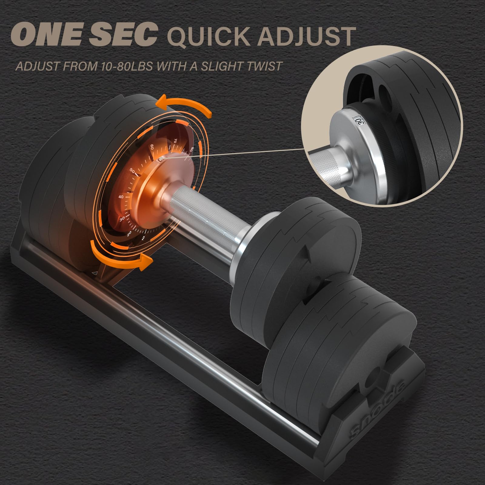 - 【Adjust weights in seconds】Turn the dial to adjust the weight. 8 weights set in one dumbbell, weight selection: 10, 20, 30, 40, 50, 60, 70, 80 lbs. SNODE Adjustable Dumbbells is to adjust the weight on both sides of the dumbbell at the same time.