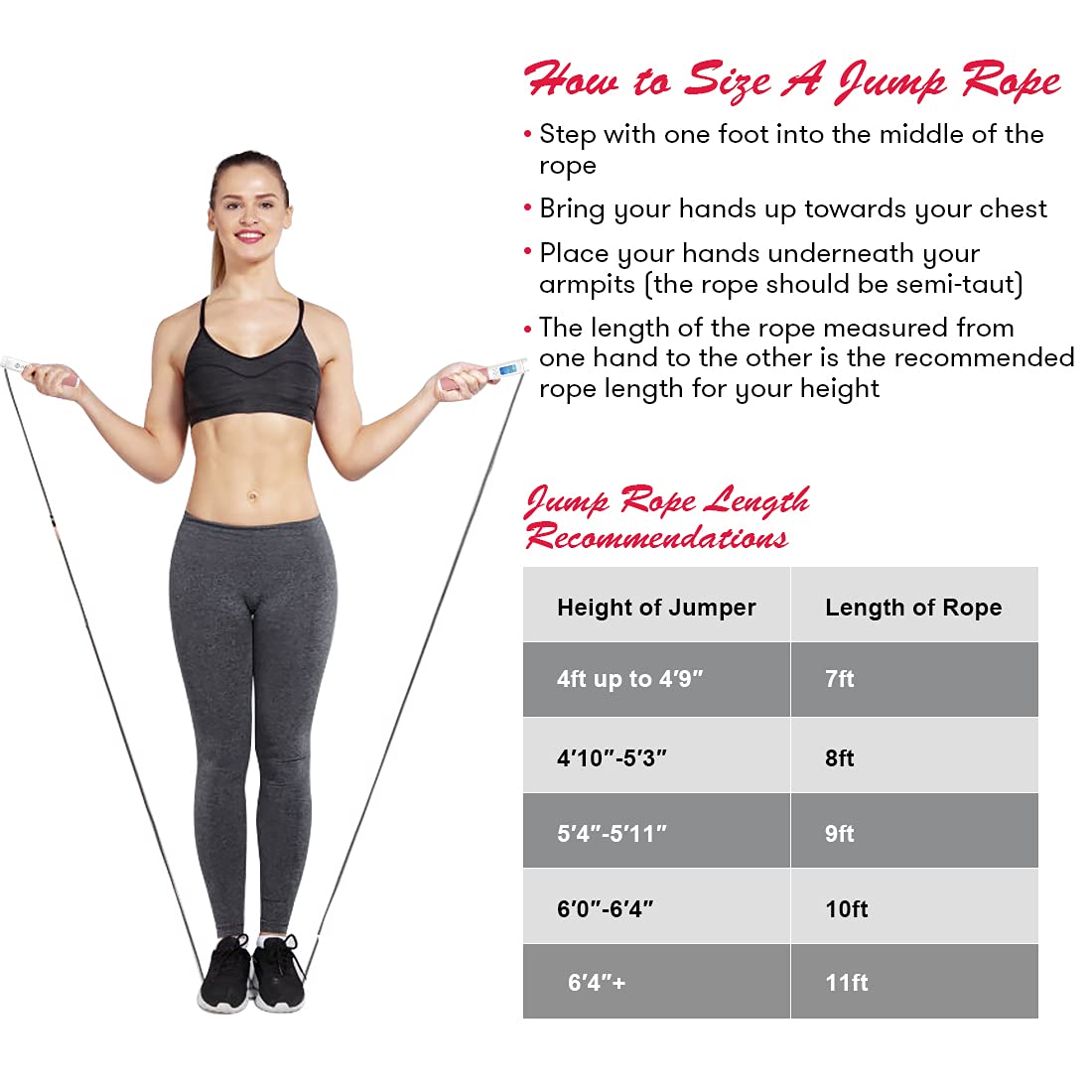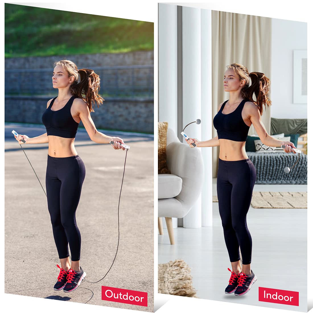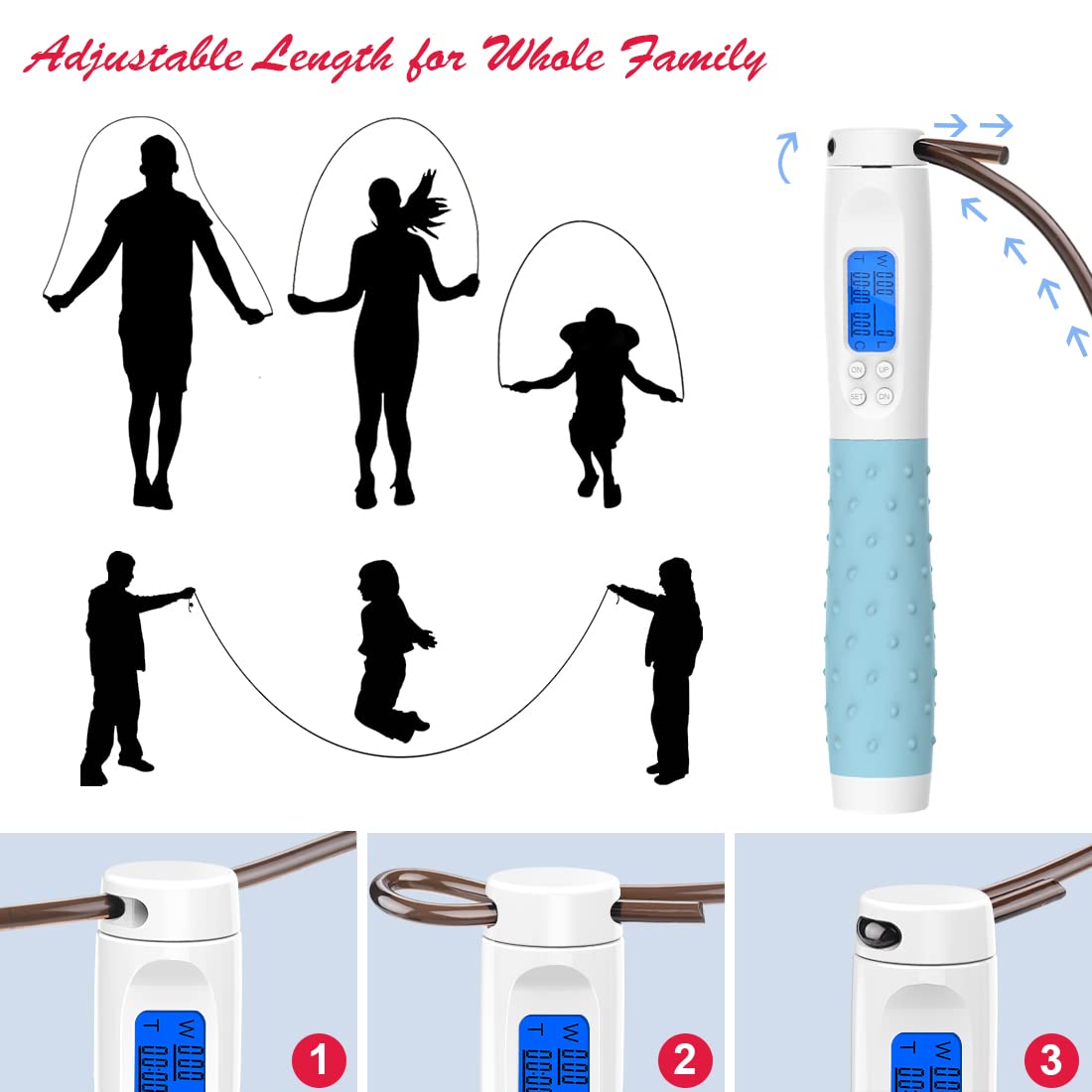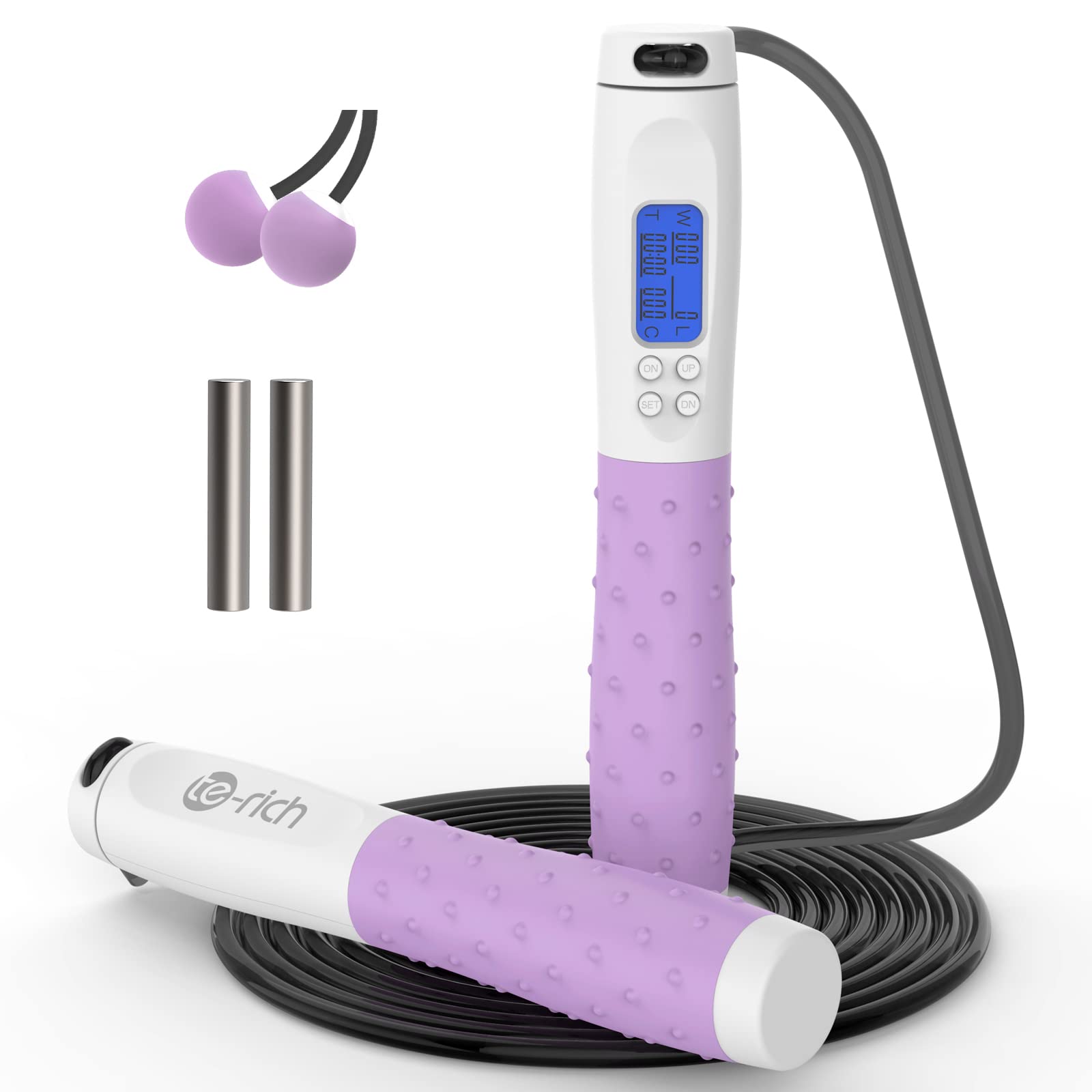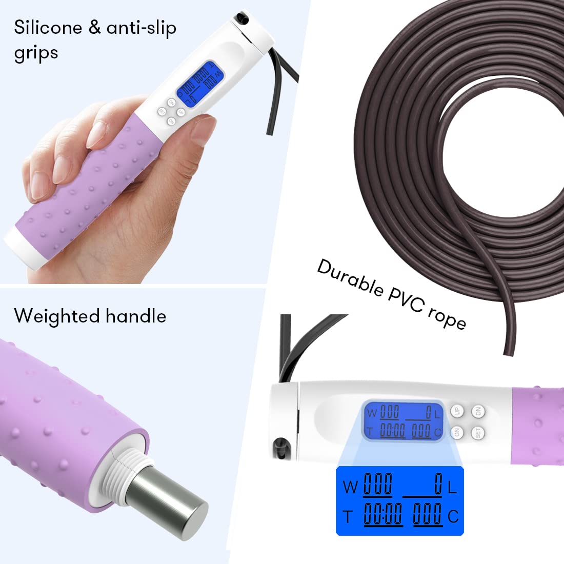 - Fitness Jump Rope with Counter - One of the handles is equipped with a backlit LCD screen, the screen will tell you how many calories you consume, how many jumps you make and how long you are training based on the user's weight; the weighted jum prope allows you to get all the calorie burning benefits of a traditional jumping rope without the interruptions of tripping on the rope