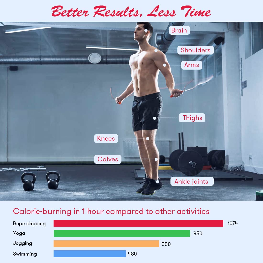 - Better Results Cost Less Time - Rope skipping is one of the most efficient calorie-burning workouts you can do; our skipping rope with grippy handles work more muscle groups than your average rope, which means you can experience a full-body workout anywhere, it works your legs, your core, your arms, your heart, and your mind, great compact home gym equipmnet for cardio and strength training workout