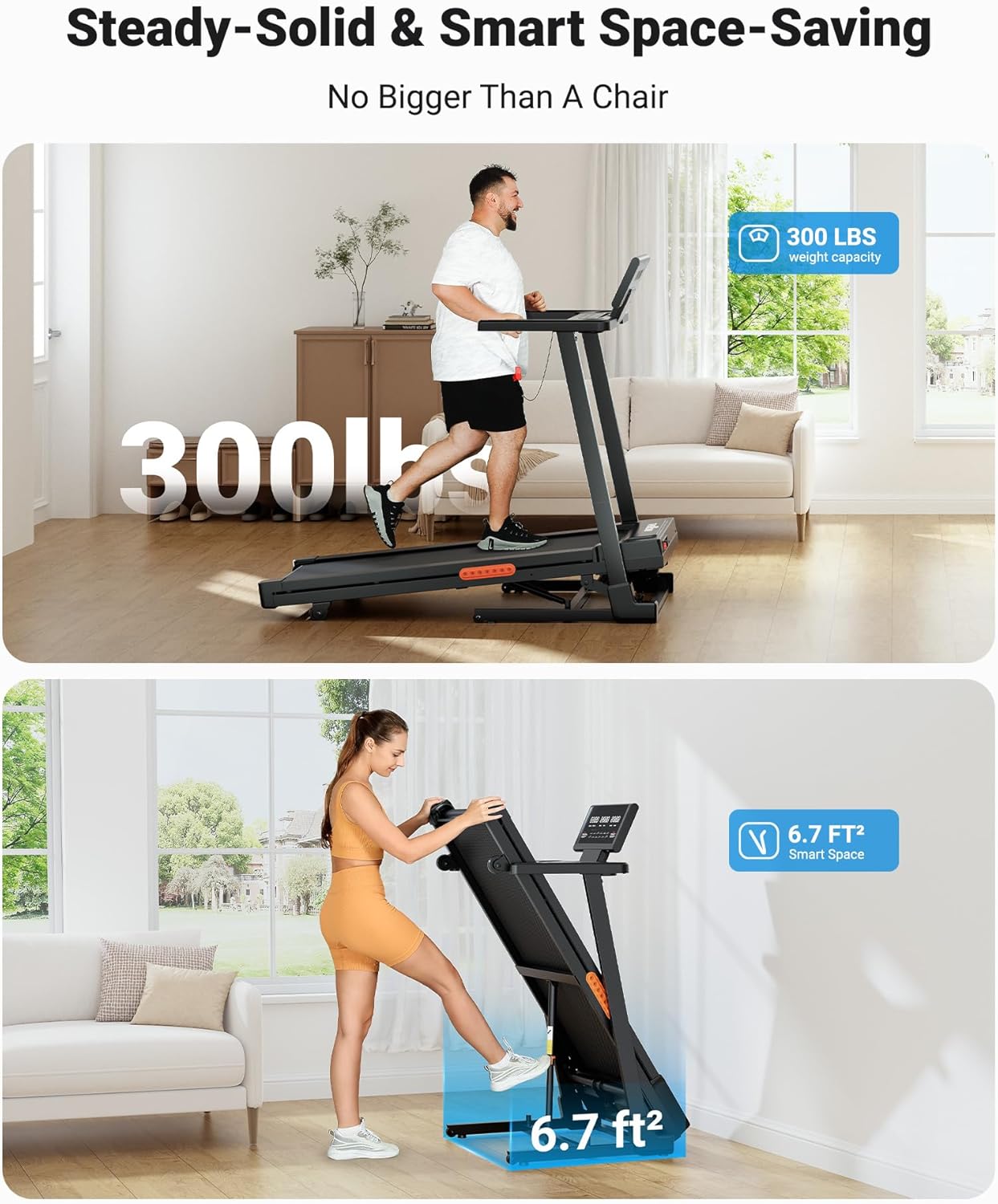 - [Spacious Belt Area & Double-Deck] This foldable treadmills for home features a double-deck design, making it stronger and more durable than traditional single decks. It supports a maximum weight capacity of 300 LBS and offers a large 47.2" x 17" running area, suspended running deck and TPR shock pads, reduces impact on your joints, accommodating the entire family