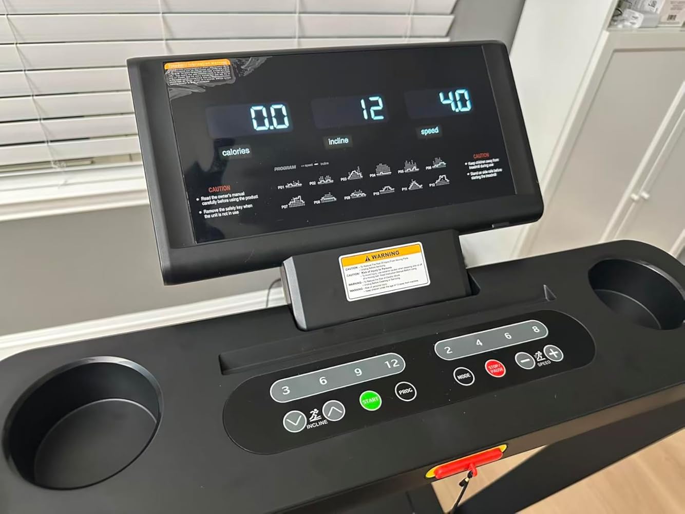 - [<20dB Quiet 12% Incline Treadmill] The walking pad of treadmill with Auto incline equipped 12% incline, speed from 0.5 MPH to 8.7 MPH, simulate the challenge of running uphill and with commercial-grade power, burn 800+ calories/h at home. The large, adjustable LED console displays Calories, Distance, Pulse, Speed, and Time. Use convenient grip sensors to track your heart rate in real-time