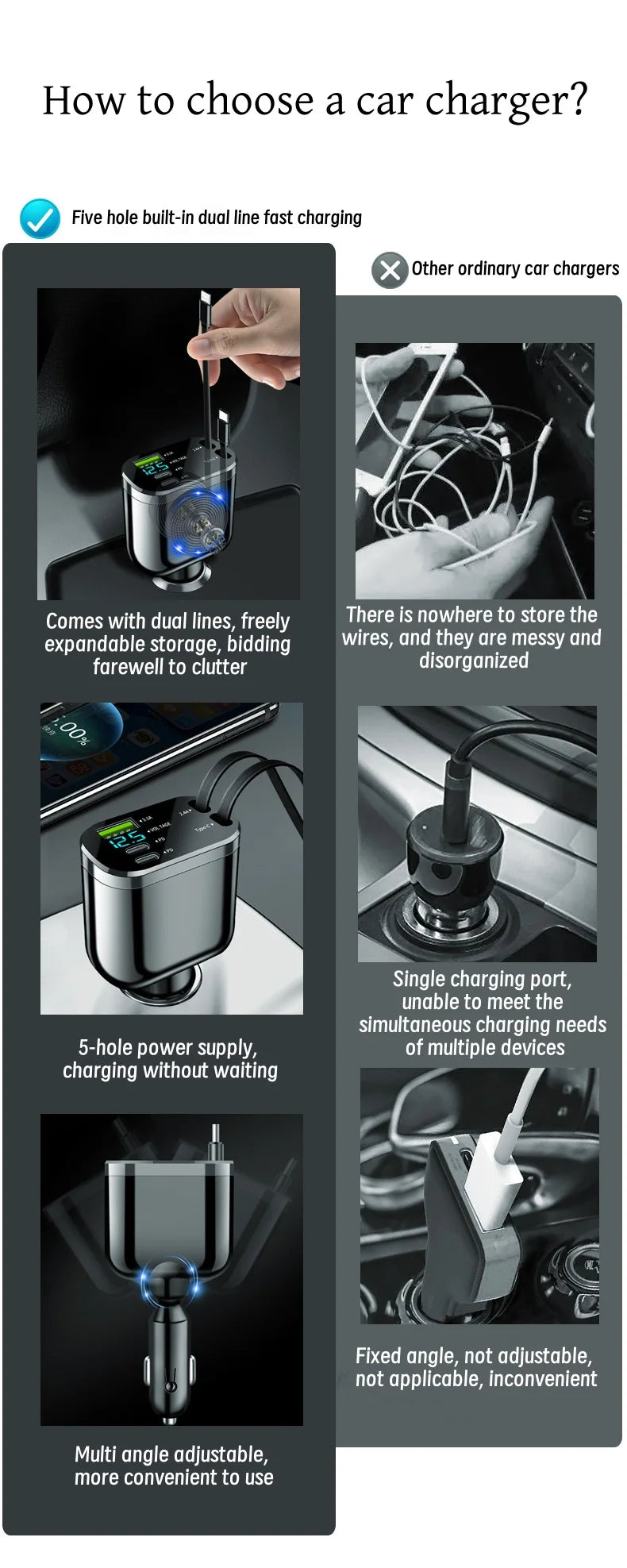 Ultra-Fast 5-in-1 USB Car Charger with Smart Voltage Display & Dual PD Ports