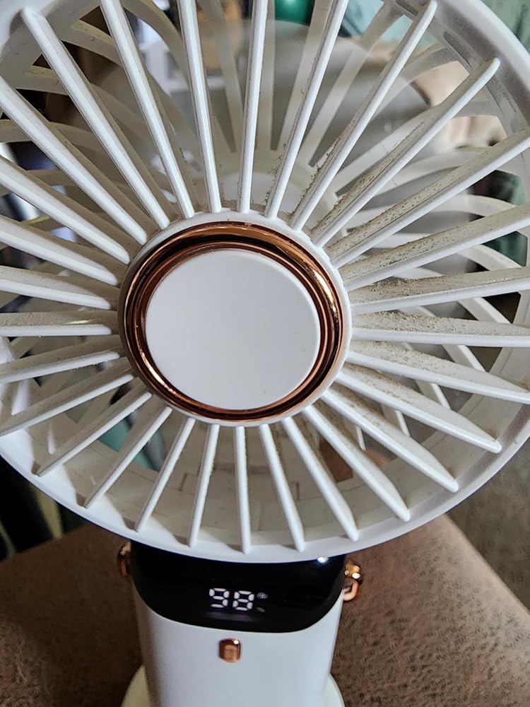 LED Display: This mini USB fan has a built-in 3000mAh battery and a digital display that shows the battery percentage in real-time, which really helps you save charging power and keep everything under control. The mini fan comes with its own base, which can be used as a mobile phone and desktop stand, free hands, and giving it to those who like to watch dramas.
