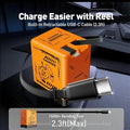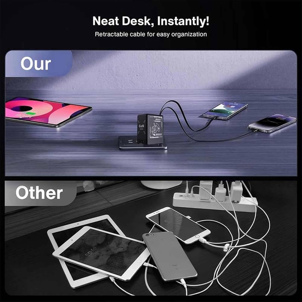 - Retractable Travel Charger with Dual Cables: Our charger fast charging comes with Type-C and L cables that extend up to 31.5 inches. 2-In-1 GaN cables automatically retract for easy storage, keeping your kitchen, office, travel space, and bedroom clean and organized—no more tangled cables