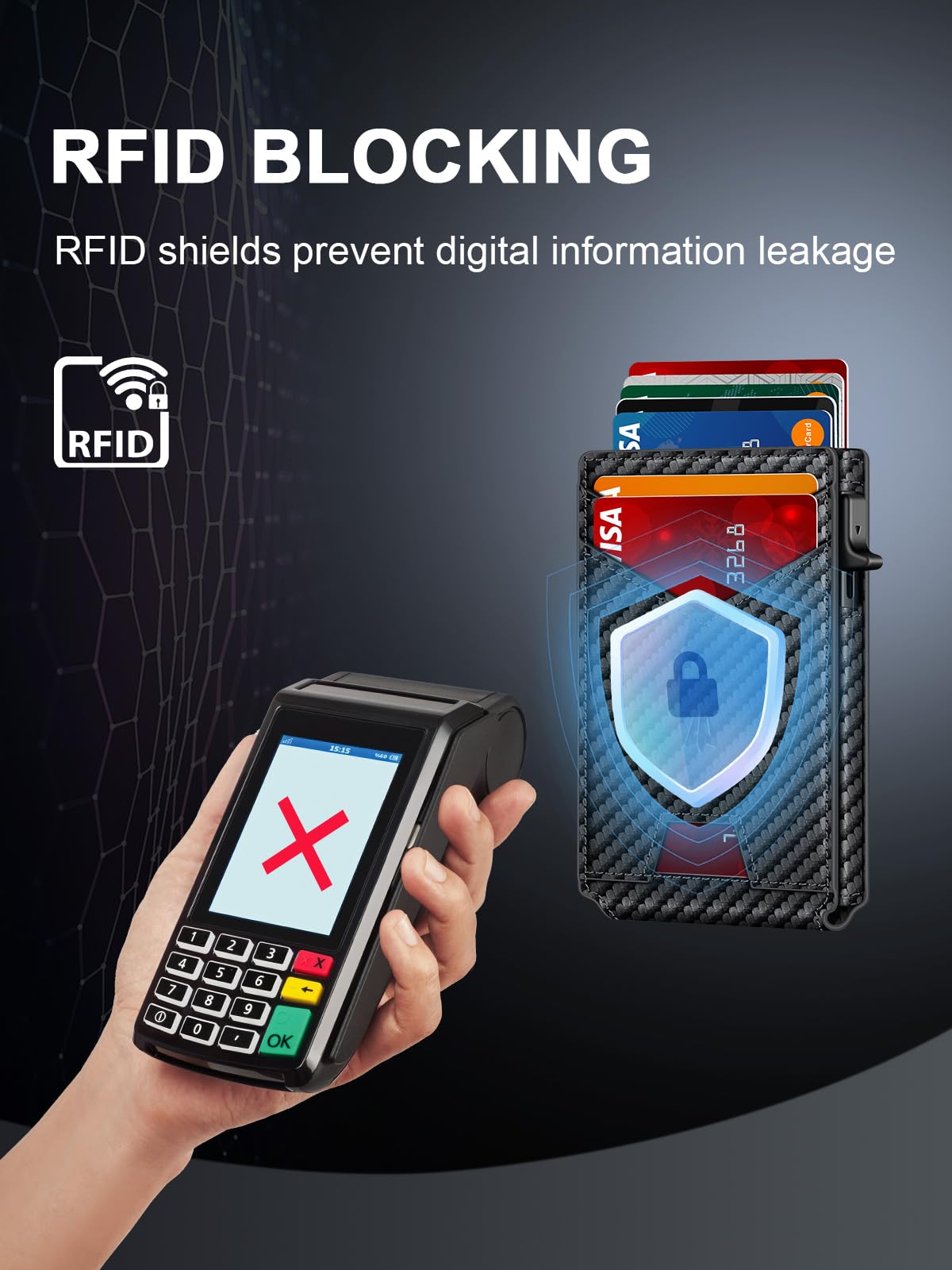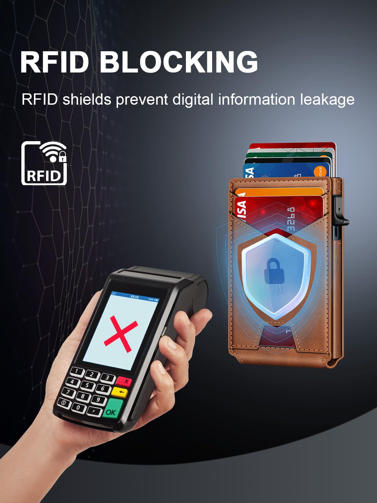 - RFID BLOCKING SECURITY - Stop digital theft! This rfid wallet for men with advanced RFID-blocking technology encrypts card data and blocks 99.9% of wireless scans. Ideal for commuters and travelers—the durable aluminum frame adds physical anti-theft protection. Securely stores IDs and credit cards with zero signal leakage. No more worrying about data theft with this wallets for men.